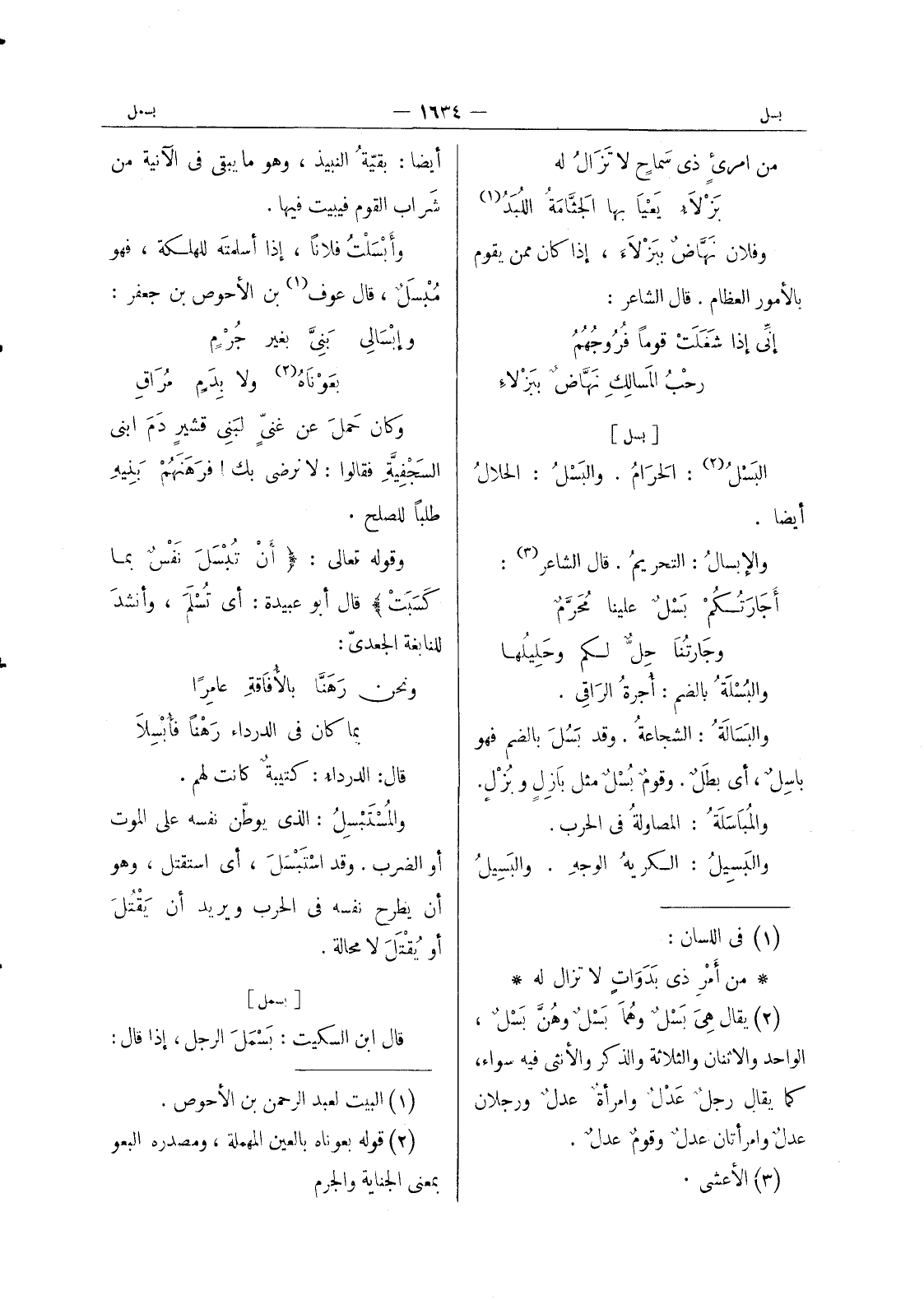 (¬2) يقال هي بسل وهما بسل وهن بسل، الواحد والاثنان والثلاثة والذكر والانثى فيه سواء، كما يقال رجل عدل وامرأة عدل ورجلان عدل وامرأتان عدل وقوم عدل.