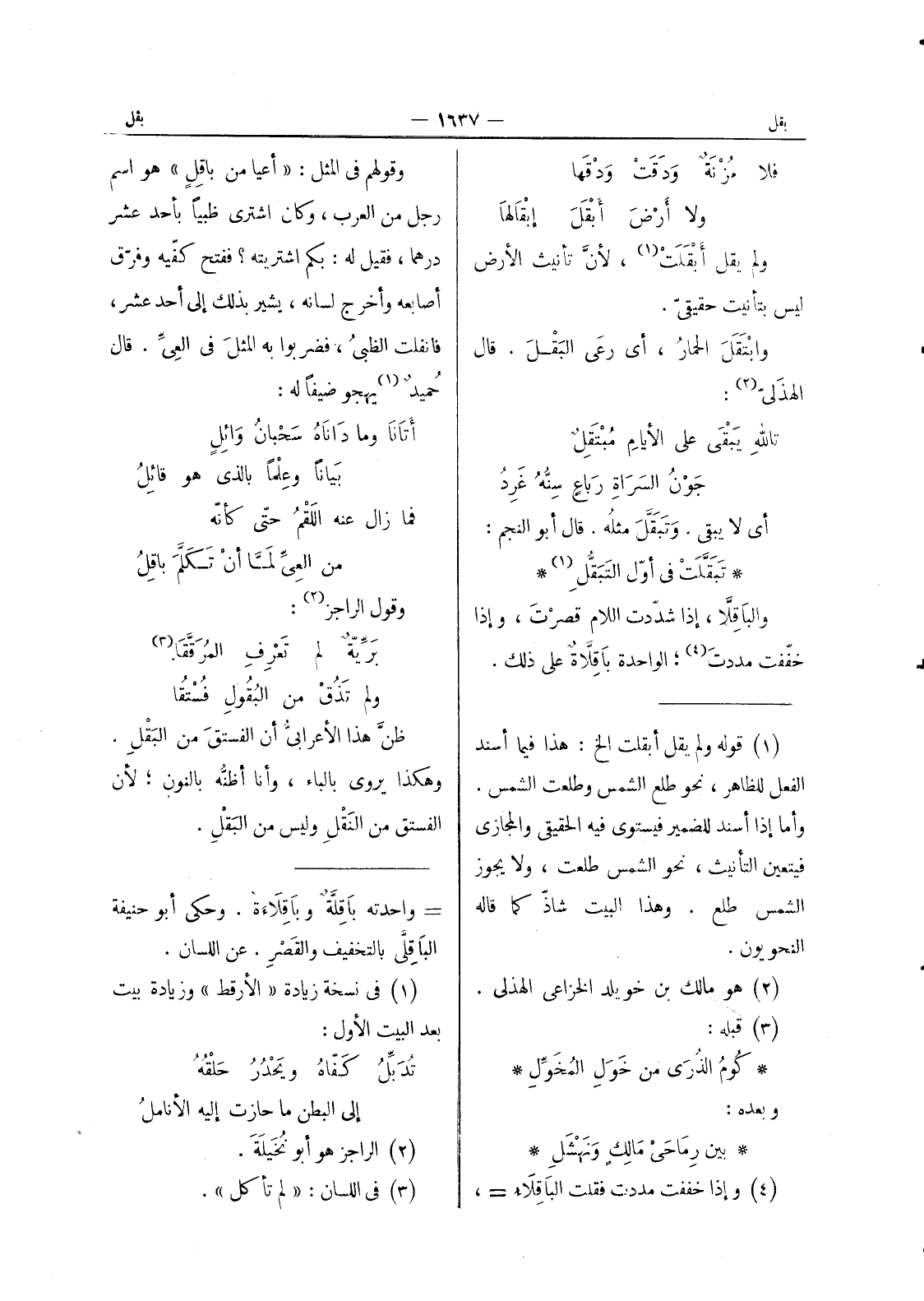 وقولهم في المثل: " أعيا من باقل " هو اسم رجل من العرب، وكان اشترى ظبيا بأحد عشر درهما، فقيل له: بكم اشتريته؟ ففتح كفيه وفرق أصابعه وأخرج لسان، يشير بذلك إلى أحد عشر، فانفلت الظبى، فضربوا به المثل في العى. قال حميد (¬1) يهجو ضيفا له: أتانا وما داناه سبحان وائل بيانا وعلما بالذى هو قائل فما زال عنه اللقم حتى كأنه من العى لما أن تكلم باقل وقول الراجز (¬2) : برية لم تعرف المرققا (¬3) ولم تذق من البقول فستقا ظن هذا الاعرابي أن الفستق من البقل. وهكذا يروى بالباء، وأنا أظنه بالنون، لان الفستق من النقل وليس من البقل.