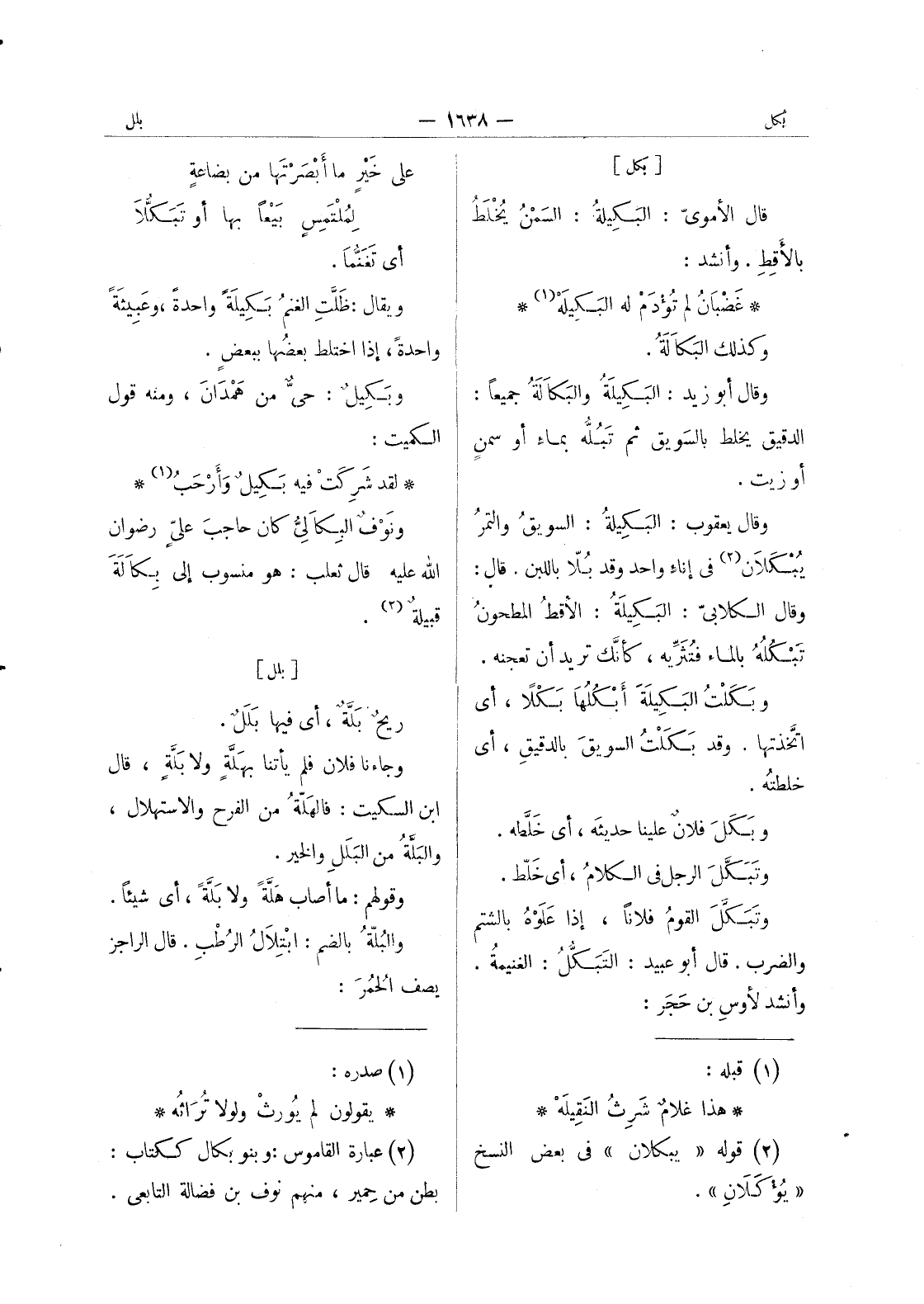 غضبان لم تؤدم له البكيله (¬1) * وكذلك البكالة. وقال أبو زيد: البَكيلَةُ والبَكالَةُ جميعاً: الدقيق يخلط بالسَويق ثم تبله بما أو سمن أوزيت. وقال يعقوب: البكيلة: السويق والتمر يبكلان (¬2) في إناء واحد وقد بلا باللبن. قال: وقال الكلابي: البكيلة: الاقط المطحون تبكله بالماء فتثريه، كأنك تريد أن تعجنه. وبكلت البكيلة أبكلها بكلا، أي اتَّخذتها. وقد بَكَلْتُ السويقَ بالدقيقِ، أي خلطتُه. وبَكَلَ فلانٌ علينا حديثَه، أي خَلَّطه. وتَبَكَّلَ الرجل في الكلام، أي خَلَط. وتَبَكَّلَ القومُ فلاناً، إذا عَلَوْهُ بالشتم والضرب. قال أبو عبيد: التَبَكُّلُ: الغنيمةُ. وأنشد لأوسِ بن حجر