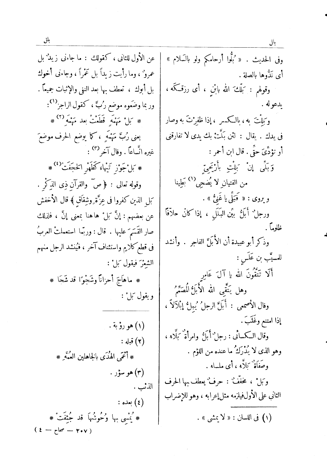 وفي الحديث. " بُلُّوا أرحامكم ولو بالسَّلام " أي نَدُّوها بالصلة. وقولهم: بَلّكَ الله بابْنٍ، أي رزقَكَه، يدعو له. وبَلِلْتَ به، بالكسر، إذا ظفِرْتَ به وصار في يدك. يقال: لئن بَلَّتْ بك يدي لا تفارقني أو تؤدِّيَ حقى. قال ابن أحمر: وبلى إن بللت بأريحى من الفتيان لا يضحى (¬1) بطينا ويروى: " فبلى يا غنى ". ورجل أبل بين البلل، إذا كان حلاّفاً ظلوماً. وذكر أبو عبيدة أن الأَبَلَّ الفاجر. وأنشد للمسيَّب بن عَلَسٍ: أَلا تَتقَّونَ الله يا آلَ عامِرٍ وهل يَتَّقي الله الأَبَلُّ المُصَمَّمُ وقال الأصمعي: أَبَلَّ الرجلُ يُبِلُّ إِبْلالاً، إذا امتنع وغَلَبَ. وقال الكسائي: رجلٌ أَبَلُّ وامرأةٌ بَلاَّءُ، وهو الذي لا يُدْرَكُ ما عنده من اللؤم. وصفاة بلاء، أي ملساء. وبل، مخفف: حرف يعطف بها الحرف الثاني على الاول فيلزمه مثل إعرابه، وهو للاضراب
