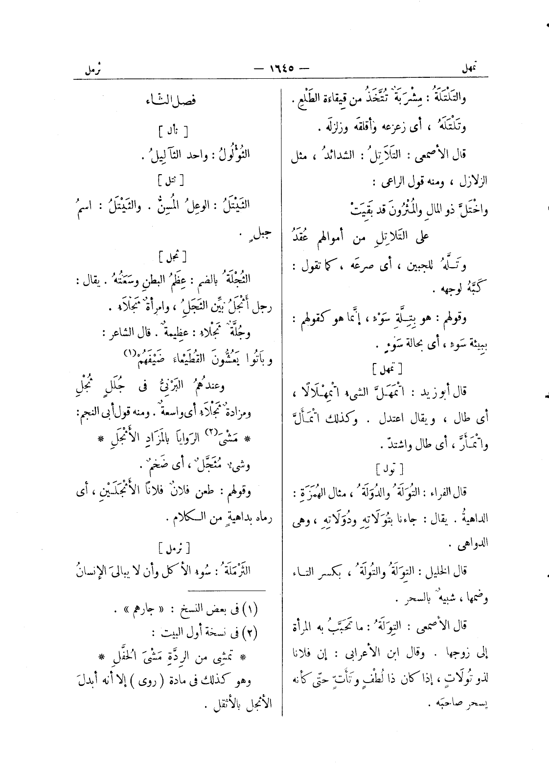 [تول] قال الفراء: التوَلَةُ والدوَلَةُ، مثال الهُمَزَةِ: الداهيةُ. يقال: جاءنا بتوَلاتِهِ ودوَلاتِهِ، وهي الدواهي. قال الخليل: التِوَلَةُ والتولَةُ، بكسر التاء وضمها، شبيهٌ بالسحر. قال الأصمعي: التولة: ما تحبب به المرأة إلى زوجها. وقال ابن الأعرابي: فلانا لذوتولات، إذا كان ذا لُطْفٍ وتَأَتٍّ حتّى كأنه يسحر صاحبه.