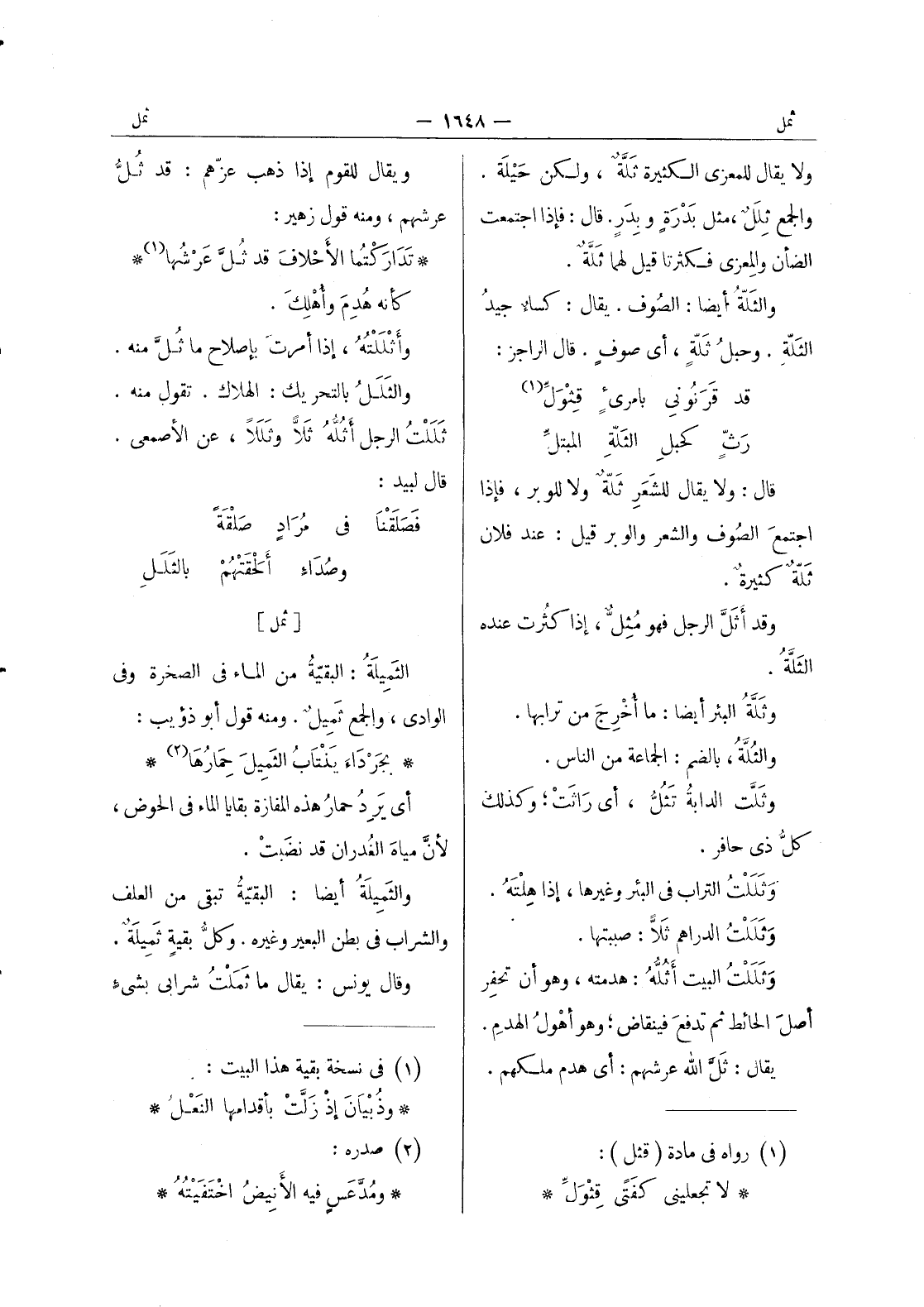 ولا يقال للمعزى الكثيرة ثلة، ولكن حيلة. والجمع ثلل، مثل بدرة وبدر. قال: فإذا اجتمعت الضأن والمعزى فكثرتا قيل لهما ثلة. والثلة أيضا: الصوف. يقال: كساءٌ جيدُ الثَلّة. وحبلُ ثلة، أي صوف. قال الراجز: قد قرنونى بامرئ قثول (¬1) رث كحبل الثلة المبتل قال: ولا يقال للشَعَرِ ثَلّةٌ ولا للوبر، فإذا اجتمعَ الصُوف والشعر والوبر قيل: عند فلان ثَلّةٌ كثيرةٌ. وقد أَثَلَّ الرجل فهو مُثِلٌّ، إذا كثُرت عنده الثَلَّة. وثَلَّةُ البئر أيضاً: ما أُخْرِجَ من ترابها. والثُلَّةُ، بالضم: الجماعة من الناس. وثَلَّت الدابةُ تَثُلُّ، أي راثَتْ، وكذلك كلُّ ذي حافر. وَثَلَلْتُ التراب في البئر وغيرها، إذا هلته. وثللت الدراهم ثلا: صببتها. وثللت البيت أثله: هدمته، وهو أن تحفِر أصلَ الحائط ثم تدفعَ فينقاض، وهو أهْولُ الهدمِ. يقال: ثَلَّ الله عرشهم: أي هدم ملكهم.