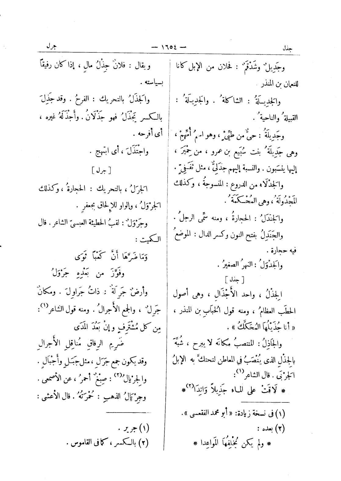وجديل وشدقم: فحلان من الابل كانا للنعمان بن المنذر والجديلة: الشا كلة. والجديلة: القبيلة والناحية. وجديلة: حى من طيئ، وهو اسم أمهم، وهى جديلة بنت سبيع بن عمرو، من حمير، إليها ينسبون. والنسبة إليهم جدلى، مثل ثففى. والجدلاء من الدروع: المنسوجة، وكذلك المجدولة، وهى المحكمة. والجندل، الحجارة، ومنه سمى الرجل. والجندل بفتح النون وكسر الدال: الموضع فيه حجارة. والجدول: النهر الصغير.