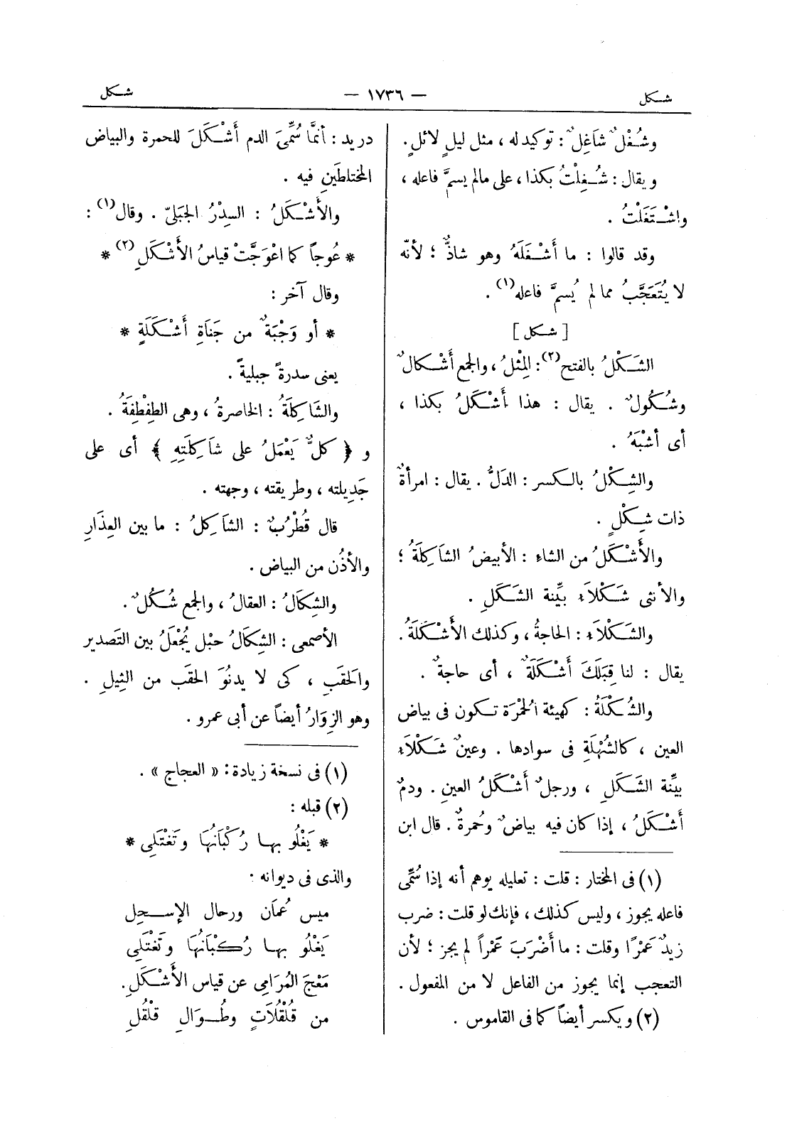 [شكل] الشَكْلُ بالفتح (¬2) : المِثْلُ، والجمع أَشْكالٌ وشُكولٌ. يقال: هذا أَشْكَلُ بكذا، أي أَشْبَهُ. والشِكْلُ بالكسر: الدال. يقال: امرأة ذات شكل. والأَشْكَلُ من الشاءِ: الأبيضُ الشاكِلَةُ، والأنثى شَكْلاءُ بيِّنَةُ الشَكَلِ. والشَكْلاءُ: الحاجةُ، وكذلك الأَشْكَلَةُ. يقال: لنا قِبَلَكَ أَشْكَلَةٌ، أي حاجةٌ. والشُكْلَةُ: كهيئة الحُمْرَةِ تكون في بياض العين، كالشُهْلَةِ في سوادها. وعينٌ شَكْلاءُ بيِّنة الشَكَلِ، ورجلٌ أَشْكَلُ العينِ. ودمٌ أَشْكَلُ، إذا كان فيه بياضٌ وحُمْرَةٌ. قال ابن