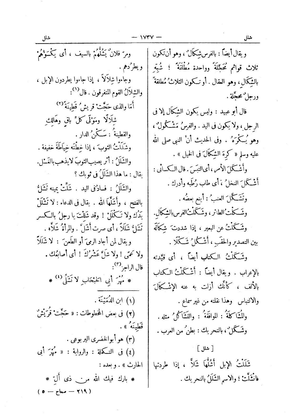 ومر فلان يشلهم بالسيف، أي يكْسَؤُهُمْ ويطرُدهم. وجاءوا شِلالاً، إذا جاءوا يطردون الإبل، والشِلالُ القوم المتفرقون. قال (¬1) : أما والذي حجت قريش قطينة (¬2) شلالا ومَوْلى كلِّ باقٍ وهالِكِ والقطينةُ: سَكْنُ الدار. وشَلَلْتُ الثوبَ، إذا خِطْتُهُ خِياطَةً خفيفة. والشَلَلُ: أثر يصيب الثوبَ لا يذهب بالغَسْل. يقال: ما هذا الشَلَلُ في ثوبك؟ والشَلَلُ: فسادٌ في اليد. شَلِّتْ يمينه تَشَلُّ بالفتح، وأَشَلَّها الله. يقال في الدعاء: لا تَشْلَلْ يَدُك ولا تَكْلَلْ! وقد شَلِلْتَ يا رجلُ بالكسر تَشَلُّ شَلَلاً، أي صرت أَشَلَّ. والمرأةُ شَلاَّءُ. ويقال لمن أجاد الرميَ أو الطَعنَ: لا شَلَلاً ولا عَمىً! ولا شَلَّ عَشْرُكَ! أي أصابعك. قال الراجز (¬3) :