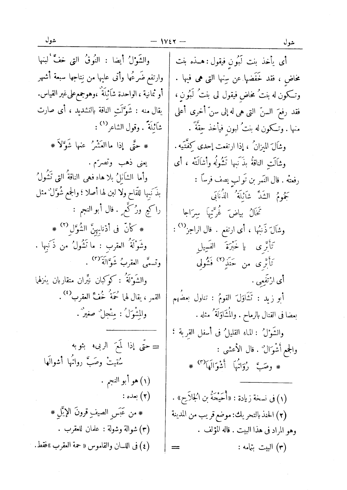 كأنّ في أذنابِهِنَّ الشُوَّلِ (¬2) * وشَوْلَةُ العقربِ: ما تَشولُ من ذَنَبِها. وتسمَّى العقربُ شَوَّالَةً (¬3) . والشَوْلَةُ: كوكبان نيِّران متقاربان ينزلهما القمر، يقال لهما حُمَةُ خُفِّ العقرب (¬4) . والمشول: منجل صغير.