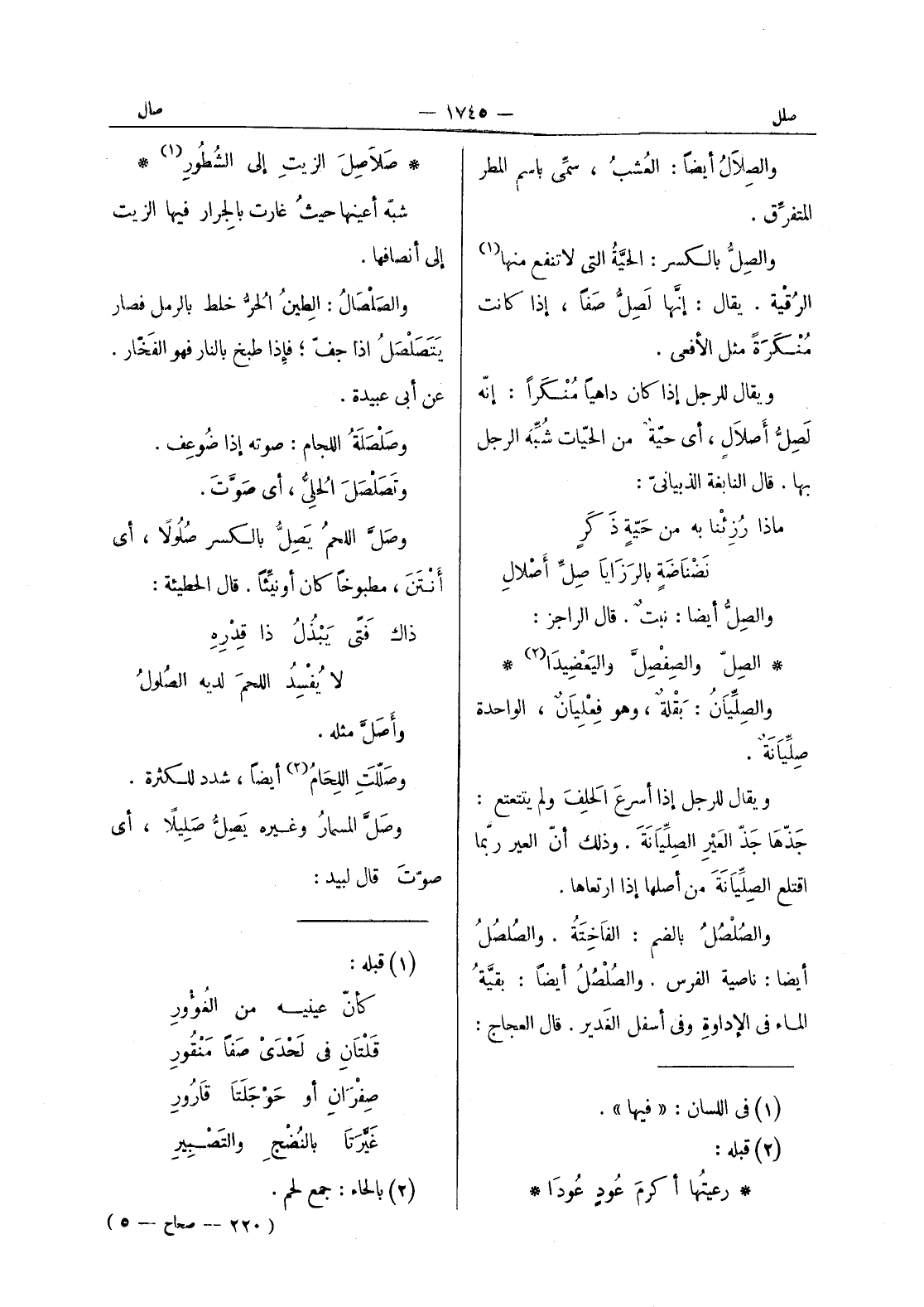 صلاصل الزيت إلى الشطور (¬1) * شبه أعينها حيث غارت بالجرار فيها الزيت إلى أنصافها. والصلصال: الطين الحر خلط بالرمل فصار يَتَصَلْصَلُ إذا جفّ، فإذا طبخ بالنار فهو الفخار. عن أبى عبيدة. وصلصلة اللجام: صوته إذا ضُوعِف. وتَصَلْصَلَ الحُلِيُّ، أي صَوَّتَ. وصل اللحم يصل بالكسر صُلولاً، أي أنْتَنَ، مطبوخاً كان أو نيِّئاً. قال الحطيئة: ذاك فَتىً يَبْذُلُ ذا قِدْرِهِ لا يُفْسِدُ اللحمَ لديه الصُلولُ وأصل مثله. وصللت اللحام (¬2) أيضا، شدد للكثرة. وصَلَّ المسمارُ وغيره يَصِلُّ صليلا، أي صوت قال لبيد