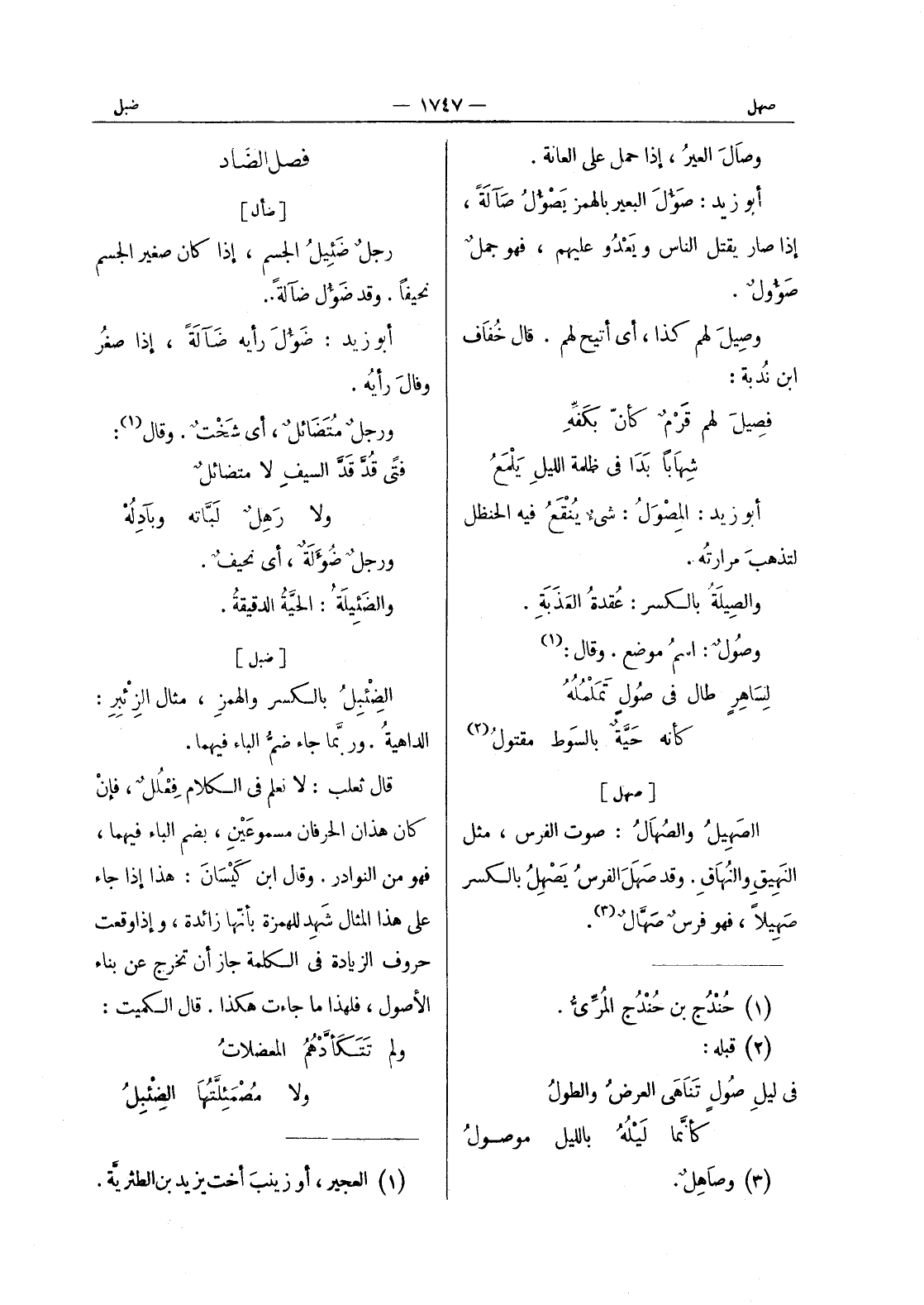 وصالَ العيرُ، إذا حمل على العانة. أبو زيد: صؤل البعير بالهمز يَصْؤُلُ صآلَةً، إذا صار يقتل الناس ويَعْدو عليهم، فهو جمل صؤول. وصيل لهم كذا، أي أتيح لهم. قال خفاف ابن نُدبة: فصيلَ لهم قَرْمٌ كأنّ بكَفِّهِ شِهاباً بَدا في ظلمة الليلِ يَلْمَعُ أبو زيد: المِصْوَلُ: شئ ينقع فيه الحنظل لتذهب مرارته. والصيلة بالكسر: عقدة العذبة. وصول: اسم موضع. وقال: (¬1) لساهر طال في صول تململه كأنه حية بالسوط مقتول (¬2)