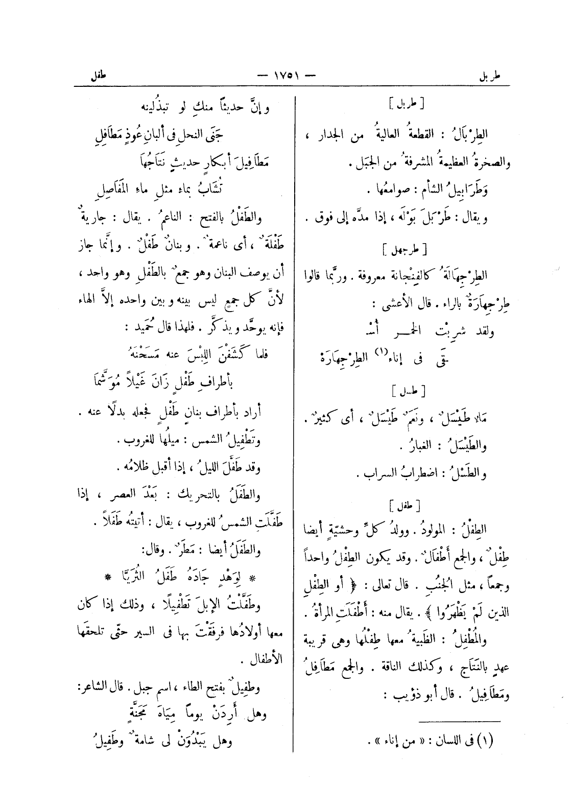 وإن حديثاً منكِ لو تبذُلينه جَنى النحلِ في ألبانِ عوذٍ مَطافِلِ مَطافيلَ أبكارٍ حديثٍ نَتاجُها تُشابُ بماءٍ مثلِ ماء المفَاصِلِ والطَفْلُ بالفتح: الناعمُ. يقال: جاريةٌ طَفْلَةٌ، أي ناعمة. وبنان طفل. وإنما جاز أن يوصف البنان وهو جمع بالطفل وهو واحد، لان كل جمع ليس بينه وبين واحده إلا الهاء فإنه يوحد ويذكر. فلهذا قال حميد: فلما كشفن اللِبْسَ عنه مَسَحْنَهُ بأطرافِ طِفْلٍ زان غيلا موشما أراد بأطراف بنان طفل فجعله بدلا عنه. وتطفيل الشمس: ميلُها للغروب. وقد طَفَّلَ الليل، إذا أقبل ظلامُه. والطَفَلُ بالتحريك: بعد العصر، إذا طَفَّلَتِ الشمس للغروب، يقال: أتيته طَفَلاً. والطَفَلُ أيضاً: مَطَرٌ. وقال: