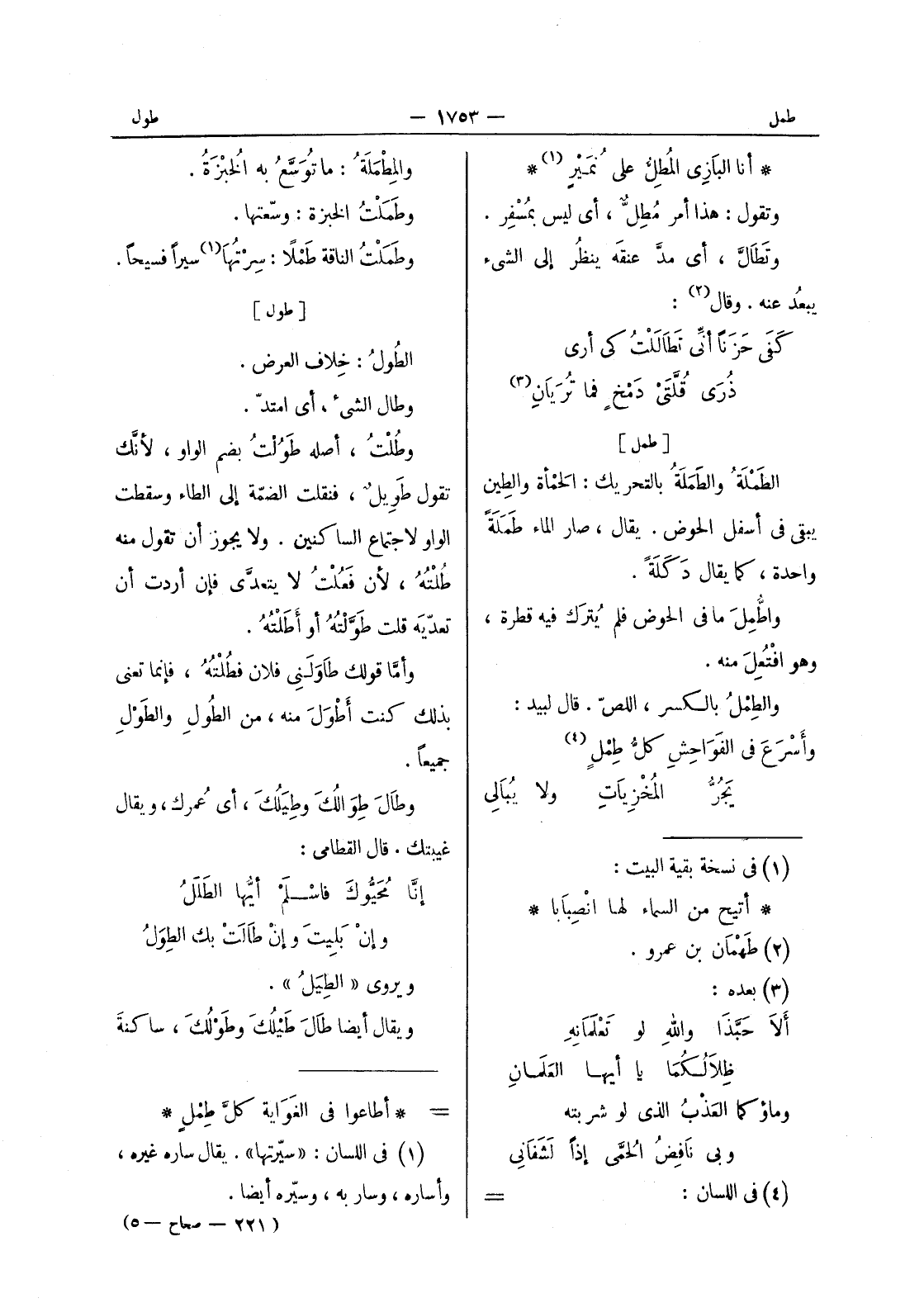 [طول] الطولُ: خِلاف العرض. وطال الشئ، أي امتد. وطلت، أصله طَوُلْتُ بضم الواو، لأنك تقول طويل، فنقلت الضمة إلى الطاء وسقطت الواو لاجتماع الساكنين. ولا يجوز أن تقول منه طلته، لان فعلت لا يتعدى فإن أردت أن تعديه قلت طَوَّلتُهُ أو أَطَلْتُهُ. وأمَّا قولك طاوَلَني فلان فطُلْتُهُ، فإنما تعني بذلك كنت أطْوَلَ منه، من الطولِ والطَوْلِ جميعاً. وطالَ طِوالُكَ وطِيَلُكَ، أي عُمرك، ويقال غيبتك. قال القطامي: إنَّا محيُّوكَ فاسْلَمْ أيُّها الطَلَلُ وإنْ بَليتَ وإنْ طالَتْ بك الطِوَلُ ويروى " الطِيَلُ ". ويقال أيضاً طالَ طَيْلُكَ وطولك، ساكنة