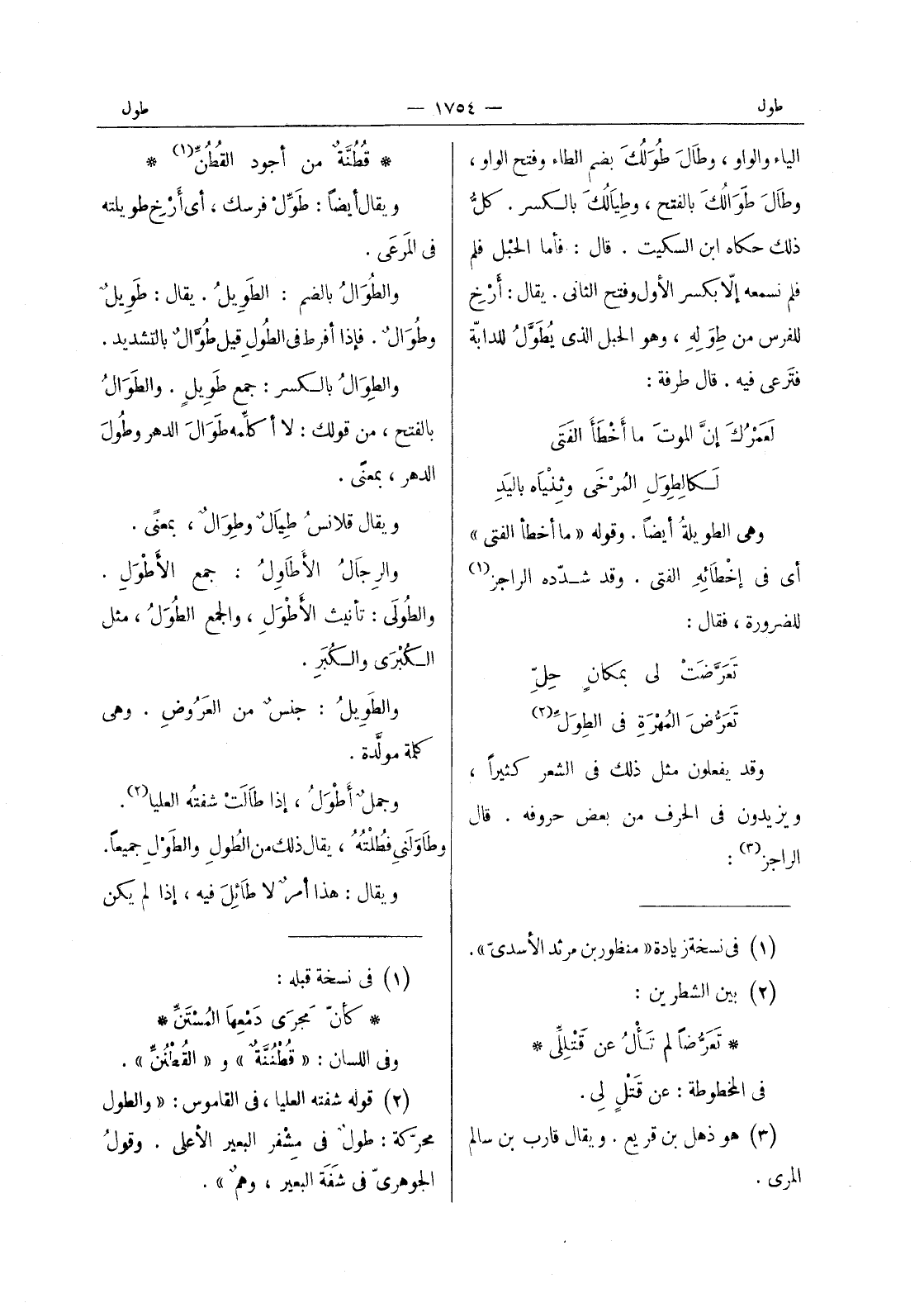 قطنة من أجود القطن (¬1) * ويقال أيضاً: طَوِّلْ فرسك، أي أَرْخِ طويلته في المَرعى. والطُوالُ بالضم: الطَويلُ. يقال: طَويلٌ وطُوالٌ. فإذا أفرط في الطولِ قيل طوال بالتشديد. والطوال بالكسر: جمع طويل. والطوال بالفتح، من قولك: لا أكلِّمه طَوالَ الدهر وطولَ الدهر، بمعنًى. ويقال قلانسُ طيالٌ وطِوالٌ، بمعنًى. والرجالُ الأطاولُ: جمع الأطْوَلِ. والطولى: تأنيث الأطْوَلِ، والجمع الطُوَلُ، مثل الكبرى والكبر. والطَويلُ: جنسٌ من العَروضِ. وهي كلمة مولَّدة. وجمل أطوَلُ، إذا طالَتْ شفتُه العليا (¬2) . وطاوَلَني فطُلْتُه، يقال ذلك من الطولِ والطَوْلِ جميعاً. ويقال: هذا أمرٌ لا طائِلَ فيه، إذا لم يكن