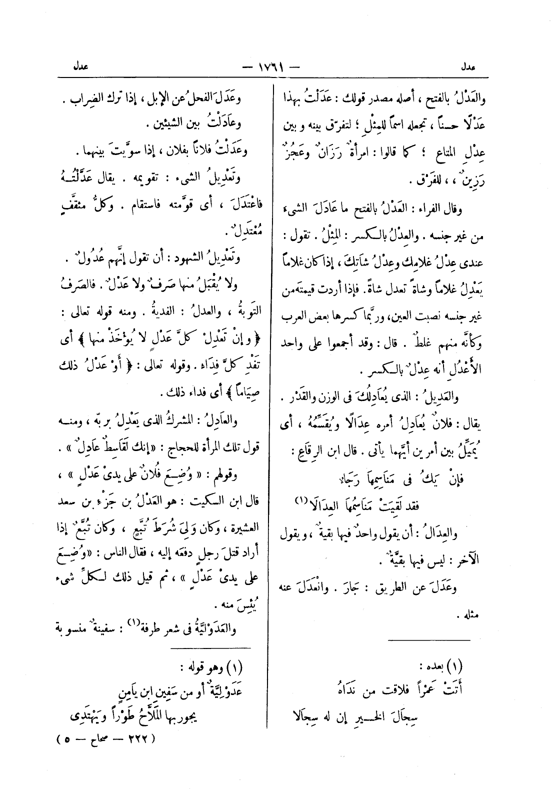 والعدل بالفتح، أصله مصدر قولك: عَدَلْتُ بهذا عَدْلاً حسناً، تجعله اسماً للمِثْلِ، لتفرّق بينه وبين عدل المتاع، كما قالوا: امرأة رزان وعجز رزين، للفرق. وقال الفراء: العَدْلُ بالفتح ما عادَلَ الشئ من غير جنسه. والعدل بالكسر: المِثْلُ. تقول: عندي عِدْلُ غلامِك وعِدْلُ شاتِكَ، إذا كانَ غلاماً يَعْدِلُ غلاماً وشاةً تعدل شاةً. فإذا أردت قيمتَه من غير جنسه نصبت العين، وربَّما كسرها بعض العرب وكأنه منه غلطٌ. قال: وقد أجمعوا على واحد الأعْدُلِ أنه عِدْلٌ بالكسر. والعَديلُ: الذي يُعادِلُكَ في الوزن والقَدْر. يقال: فلانٌ يُعادِلُ أمره عِدالاً ويُقَسِّمُهُ، أي يُمَيِّلُ بين أمرين أيهما يأتي. قال ابن الرقاع: فإن يك في مناسهما رجاء فقد لقيت مناسمها العدالا (¬1) والعدال: أن يقول واحدٌ فيها بقيةٌ، ويقول الآخر: ليس فيها بقيَّةٌ. وعَدَلَ عن الطريق: جارَ. وانْعَدَلَ عنه مثله.