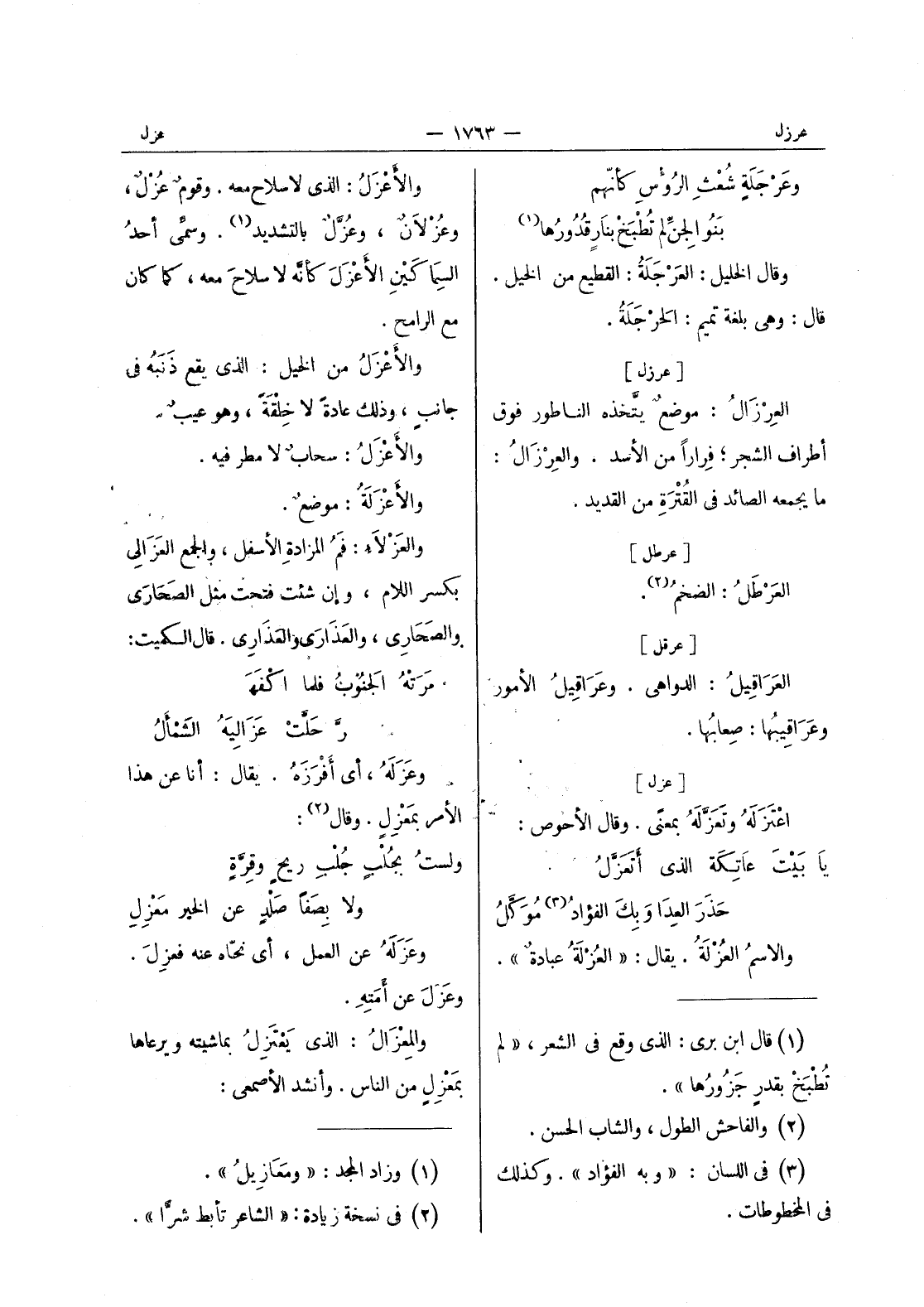 والاعزل: الذى لا سلاح معه. وقول عزل، وعزلان، وعزل بالتشديد (¬1) . وسمِّي أحدُ السِماكَيْن الأعزَلَ كأنَّه لا سلاحَ معه، كما كانَ مع الرامح. والأعْزَلُ من الخيل: الذي يقع ذَنَبُه في جانب، وذلك عادةً لا خِلقةً، وهو عيبٌ. والأعْزَلُ: سحابٌ لا مطر فيه. والاعزلة: موضع. والعزلاء: فم المزادة الأسفل، والجمع العَزالي بكسر اللام، وإن شئت فتحت مثل الصَحارى والصحارى، والعذارى والعذارى. قال الكميت: مرته الجنوب فلما اكفه رحلت عزاليه الشَمْألُ وعَزَلَهُ، أي أفْرَزَهُ. يقال: أنا عن هذا الأمر بِمَعْزِلٍ. وقال (¬2) : ولستُ بجُلْبٍ جُلْبِ ريحٍ وقرَّةٍ ولا بصَفاً صَلْدٍ عن الخير مَعْزِلِ وعَزَلَهُ عن العمل، أي نحّاه عنه فعزِلَ. وعزل عن أمَتِهِ. والمِعْزالُ: الذي يَعْتَزِلُ بماشيته ويرعاها بمَعْزِلٍ من الناس. وأنشد الاصمعي