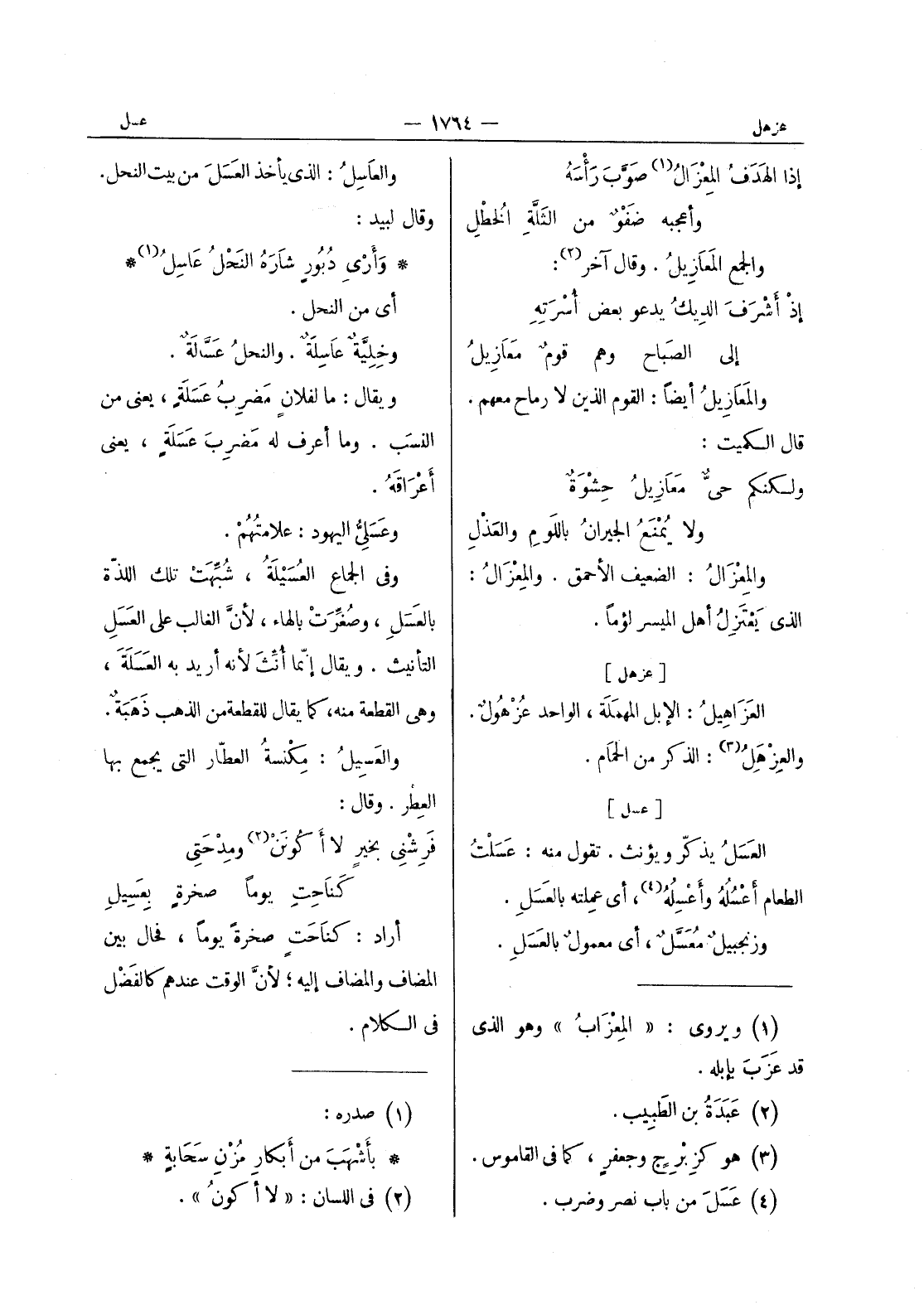 [عزهل] العَزاهيلُ: الإبل المهمَلَة، الواحد عُزْهولٌ. والعِزْهَلُ (¬3) : الذكر من الحمام.