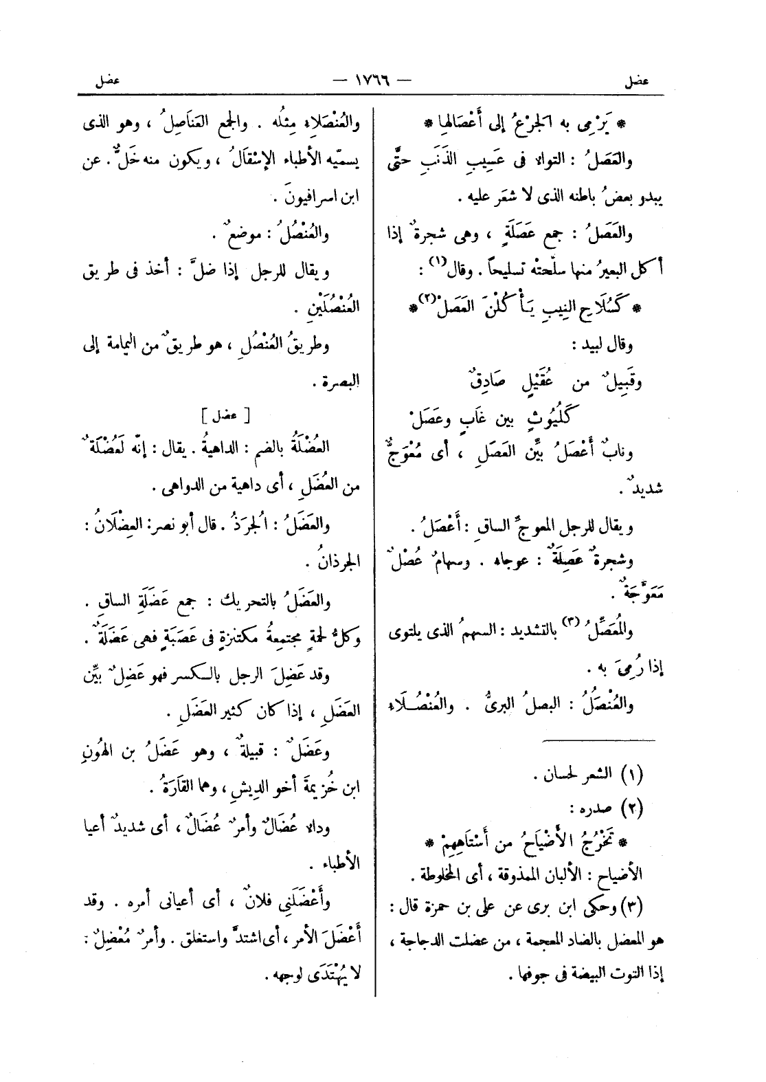 كسلاح النيب يأكلن العصل (¬2) * وقال لبيد: وقَبيلٌ من عُقَيْلٍ صادِقٍ كَلُيوثٍ بين غابٍ وعَصَلْ ونابٌ أعْصَلُ بيِّن العَصَلِ، أي مُعْوَجٌّ شديدٌ. ويقال للرجل المعوجِّ الساقِ: أعْصَلُ. وشجرةٌ عَصِلَةٌ: عوجاءُ. وسهام عصل معوجة. والمعصل (¬3) بالتشديد: السهم الذي يلتوي إذا رُمِيَ به. والعنصل: البصل البرى. والعنصلاء