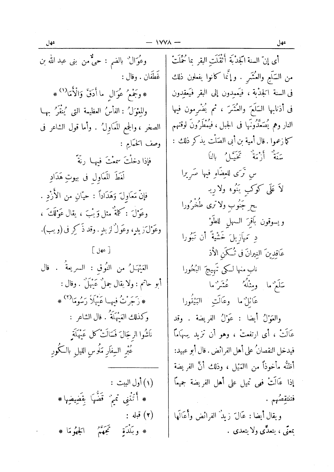 أي إن السنة الجدبة أثقلت البقر بما حملت من السلع والعشر. وإنما كانوا يفعلون ذلك في السنة الجدبة، فيعمدون إلى البقر فيعقدون في أذنابها السلع والعشر، ثم يضرمون فيها النار وهم يصعدونها في الجبل، فيمطرون لوقتهم كما زعموا. قال أمية بن أبى الصلت يذكر ذلك: سنة أزمة تخيل بالنا من ترى للعضاه فيها صريرا لا على كوكب ينوء ولا ريح جنوب ولا ترى طخرورا ويسوقون باقر السهل للطو د مهازيل خشية أن تبورا عاقدين النيران في ثكن الاذ ناب منها لكى تهيج البحورا سلع ما ومثله عشر ما عائل ما وعالت البيقورا والعول أيضاً: عَوْلُ الفريضة. وقد عالَتْ، أي ارتفعت، وهو أن تزيد سِهاماً فيدخل النقصانُ على أهل الفرائض. قال أبو عبيد: أظنه مأخوذا من الميل، وذلك أن الفريضة إذا عالت فهى تميل على أهل الفريضة جميعا فتنتقصهم. ويقال أيضا: عال زيد الفرائض وأعالَها بمعنًى، يتعدَّى ولا يتعدى.