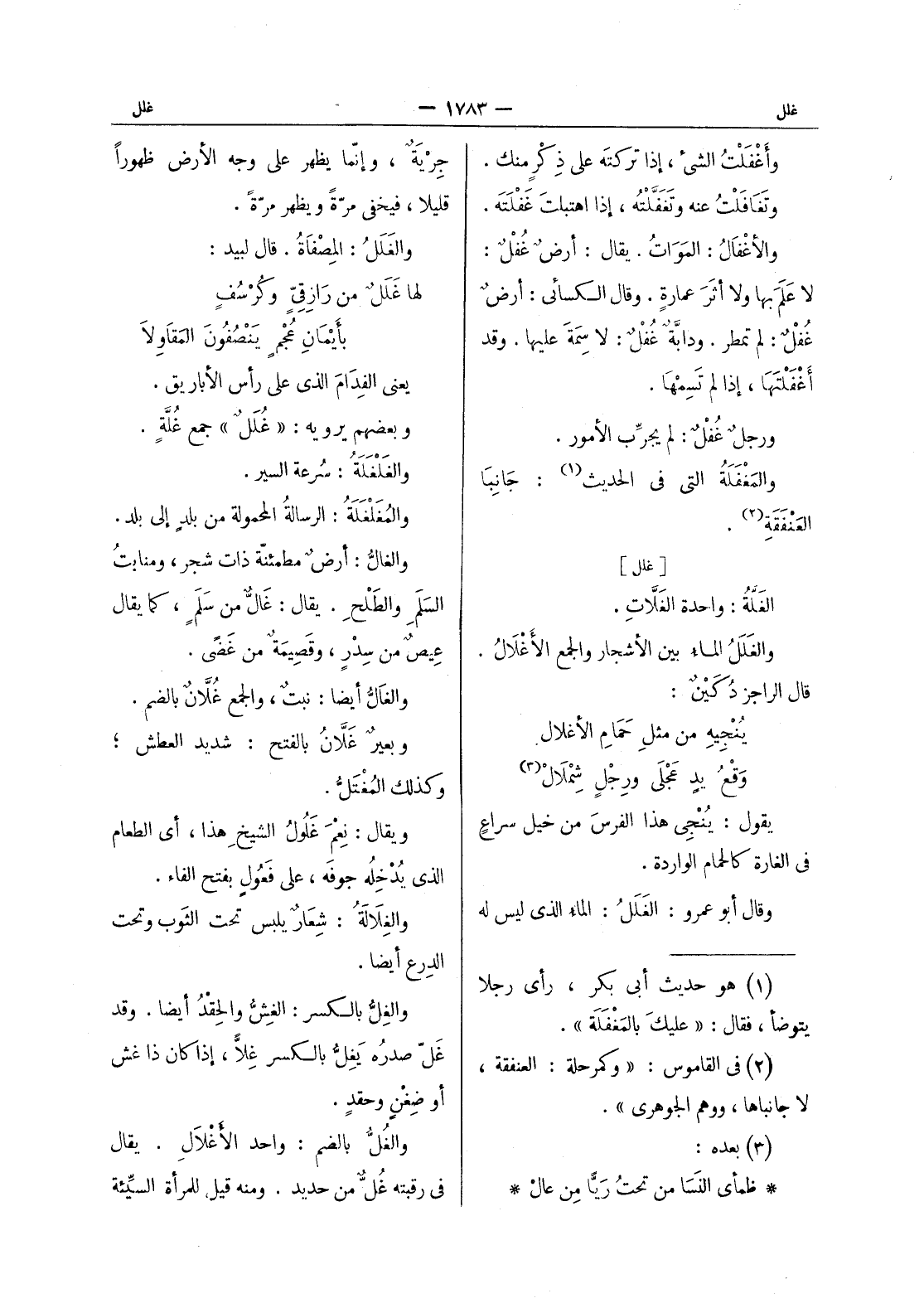 جرية، وإنما يظهر على وجه الأرض ظهوراً قليلاً، فيخفى مرّةً ويظهر مرّةً. والغلل: المصفاة. قال لبيد: لها غلل من رازقي وكرسف بأيمان عجم ينصفون المقاولا يعنى الفدام الذى على رأس الاباريق. وبعضهم يرويه: " غلل " جمع غلة. والغلغلة: سرعة السير. والمغلغلة: الرسالةُ المحمولة من بلدٍ إلى بلد. والغال: أرض مطمئنة ذات شجر، ومنابتُ السَلَمِ والطَلْحِ. يقال: غال من سلم، كما يقال عيص من سدر، وقصيمة من غضى. والغالُّ أيضاً: نبتٌ، والجمع غُلاَّنٌ بالضم. وبعيرٌ غَلاَّنُ بالفتح: شديد العطش، وكذلك المُغْتَلُّ. ويقال: نِعْمَ غَلولُ الشيخ هذا، أي الطعام الذي يدخِلُه جوفَه، على فَعولٍ بفتح الفاء. والغِلالَةُ: شِعارٌ يلبس تحت الثوب وتحت الدِرع أيضاً. والغِلُّ بالكسر: الغشُّ والحِقدُ أيضاً. وقد غلّ صدره يَغِلُّ بالكسر غِلاًّ، إذا كان ذا غش أو ضِغْنٍ وحقدٍ. والغُلُّ بالضم: واحد الأغْلال. يقال في رقبته غُلٌّ من حديد. ومنه قيل للمرأة السيئة