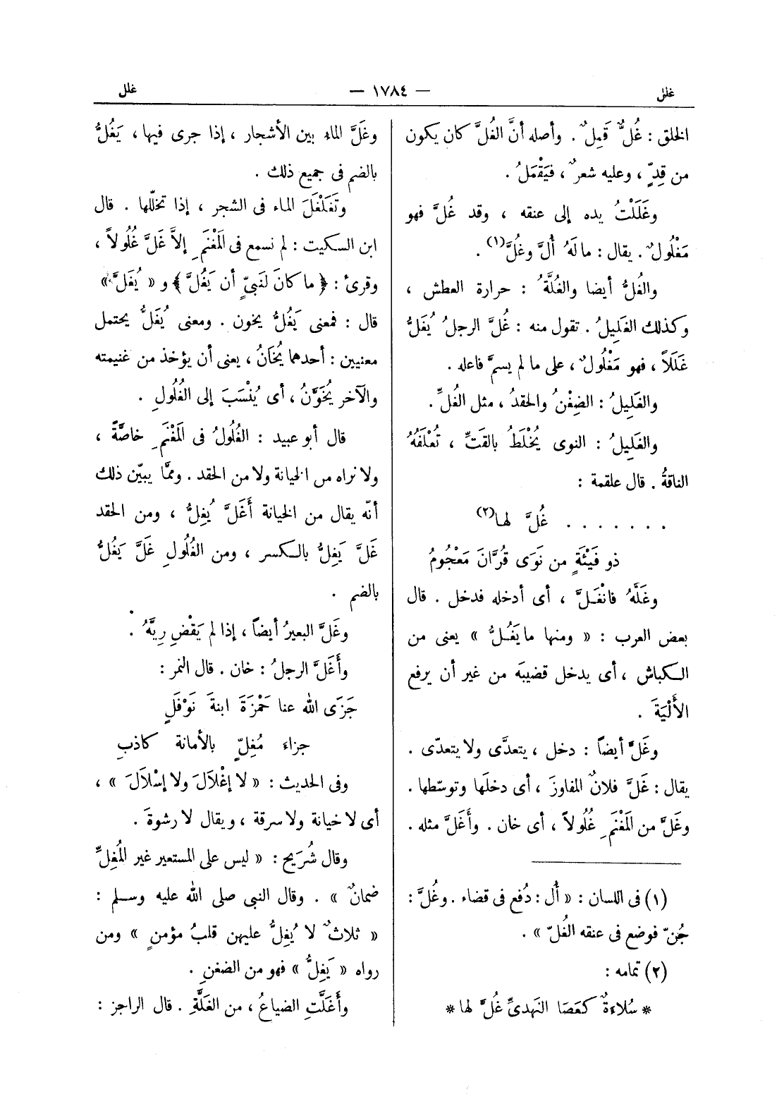 وغل الماء بين الأشجار، إذا جرى فيها، يَغُلُّ بالضم في جميع ذلك. وتغلغل الماء في الشجر، إذا تخلَّلها. قال ابن السكيت: لم نسمع في المَغْنَمِ إلا غلَّ غُلولاً، وقرئ: (ما كان لِنَبِيٍّ أن يَغُلَّ) و " يُغَلَّ " قال: فمعنى يَغُلُّ يخون. ومعنى يُغَلُّ يحتمل معنيين: أحدهما يُخانُ، يعني أن يؤخذ من غنيمته والآخر يُخَوَّنُ، أي يُنسب إلى الغلول. قال أبو عبيد: الغُلولُ في المغنمِ خاصَّةً، ولا نراه من الخيانة ولا من الحقد. وممَّا يبيِّن ذلك أنَّه يقال من الخيانة أغَلَّ يُغِلُّ، ومن الحقد غَلَّ يَغِلُّ بالكسر، ومن الغُلولِ غَلَّ يَغُلُّ بالضم. وغَلَّ البعير أيضاً، إذا لم يقض رِيَّه. وأغَلَّ الرجلُ: خان. قال النمر: جزى الله عنا حمزَةَ ابنةَ نوفلٍ جزاَء مُغِلٍّ بالأمانة كاذبِ وفي الحديث: " لا إغْلالَ ولا إسْلالَ "، أي لا خيانة ولا سرقة، ويقال لا رشوة. وقال شريح: " ليس على المستعير غير المغل ضمان ". وقال النبي صلى الله عليه وسلم: " ثلاث لا يغل عليهن قلب مؤمن " ومن رواه " يغل " فهو من الضغن. وأغلت الضياع، من الغلة. قال الراجز:
