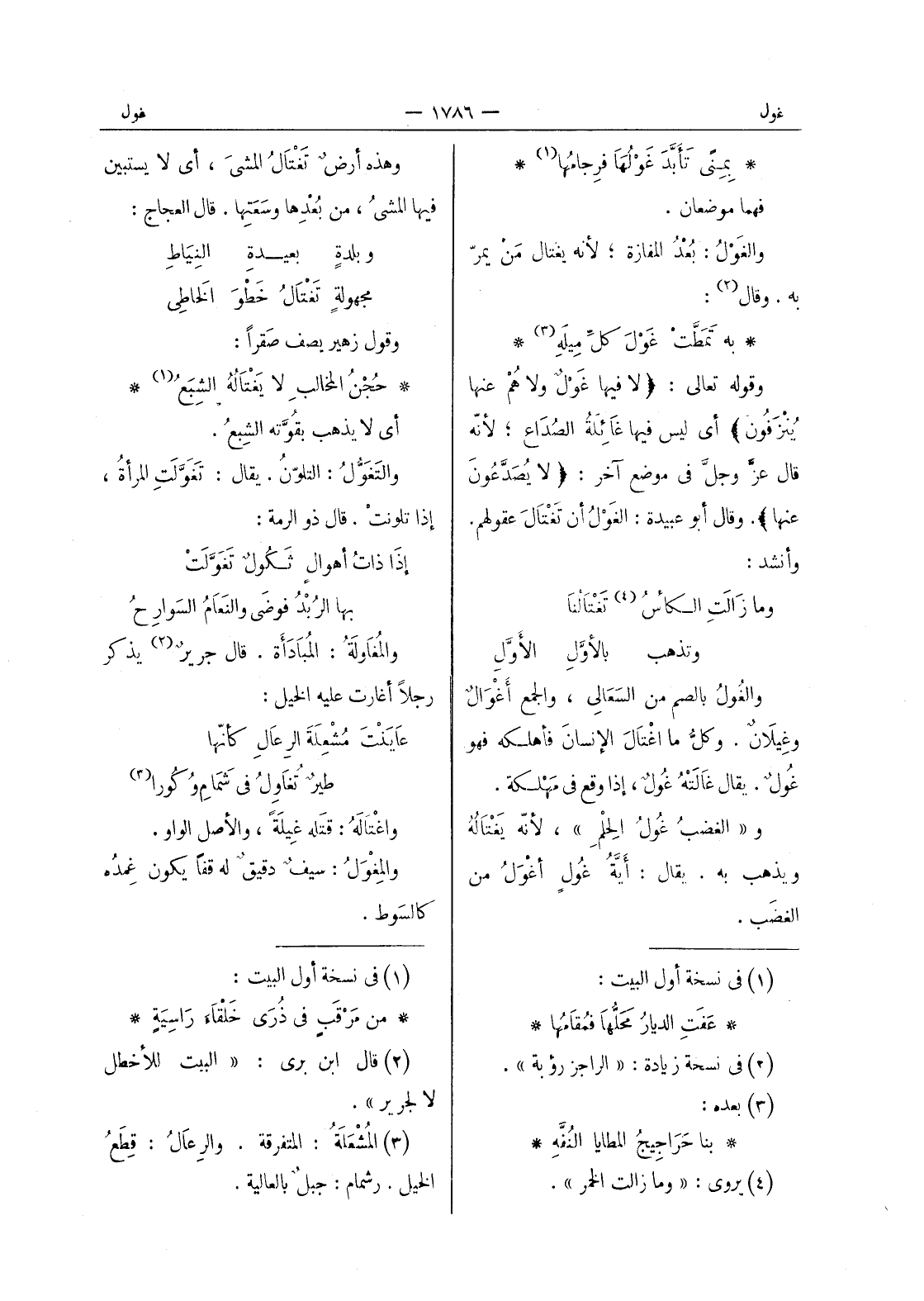 حُجْنُ المخالبِ لا يَغتالُهُ الشِبَعُ (¬1) * أي لا يذهب بقوَّته الشِبع. والتَغَوُّلُ: التلوّن. يقال: تَغَوَّلَتِ المرأةُ، إذ تلونت. قال ذو الرمة: إذا ذاتُ أهوالٍ ثَكولٌ تَغَوَّلَتْ بها الرُبْدُ فوضى والنَعامُ السَوارحُ والمُغاوَلَةُ: المُبادأة. قال جريرٌ (¬2) يذكر رجلا أغارت عليه الخليل: عاينت مشعلة الرعال كأنها طير تغول في شَمامِ وُكورا (¬3) واغْتالَهُ: قتلَه غيلَةً، والأصل الواو. والمِغْوَلُ: سيفٌ دقيقٌ له قفاً يكون غِمده كالسوط.