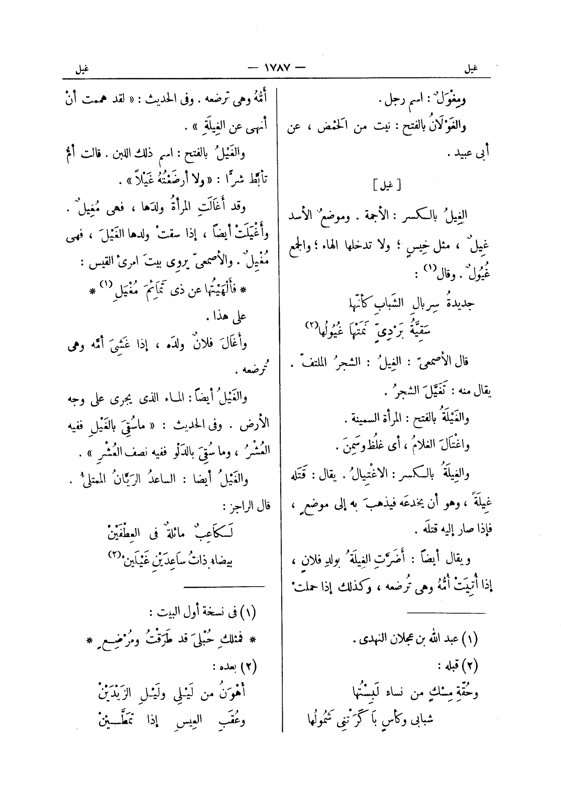 [غيل] الغيلُ بالكسر: الأجمة. وموضعُ الاسد غيل، مثل خيس، ولا تدخلها الهاء، والجمع غيول. وقال (¬1) : جديدةُ سِرْبالِ الشبابِ كأنَّها سَقِيَّةُ بَرْدِيٍّ نَمَتْها غُيولُها (¬2) قال الأصمعيّ: الغِيلُ: الشجر الملتف. يقال منه: تَغَيَّلَ الشجر. والغَيْلَةُ بالفتح: المرأة السمينة. واغتال الغلام، أي غلظ وسَمن. والغيلَةُ بالكسر: الاغْتيالُ. يقال: قَتَله غيلَةً، وهو أن يخدعه فيذهب به إلى موضعٍ، فإذا صار إليه قتلَه. ويقال أيضاً: أضَرَّتِ الغيلَةُ بولدِ فلانٍ، إذا أُتِيَتْ أمَُّه وهي ترضعه، وكذلك إذا حملت