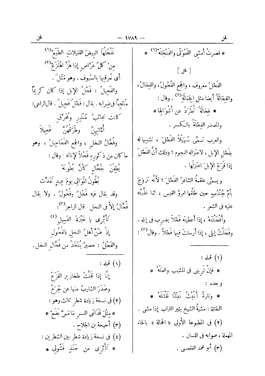 فحالة تطرد عن أشوالها * والمصدر الفحلة بالكسر. والعرب تسمِّي سُهَيْلاً الفَحْلَ، تشبيهاً له بفَحْلِ الإبل، لاعتزاله النجوم: وذلك أنَّ الفَحْلَ إذا قرع الابل اعتزلها. ويسمى علقمة الشاعر الفحل: لانه تزوج بأم جندب حين طلقها امرؤ القيس، لما غلبته عليه في الشعر. وأفحلته، إذا أعطيتَه فَحْلاً يضرِب في إبله. وفَحَلْتُ إبلي، إذا أرسلتَ فيها فحلا. وقال (¬3)