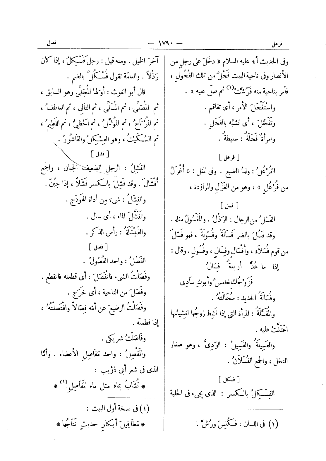 [فشل] الفَشِلُ: الرجل الضعيف الجبان، والجمع أفشال. وقد فشل بالكسر فشلا، إذا جبن. والفشل: شئ من أداة الهودج. وتفشل الماء، أي سال. والفيشلة: رأس الذكر.