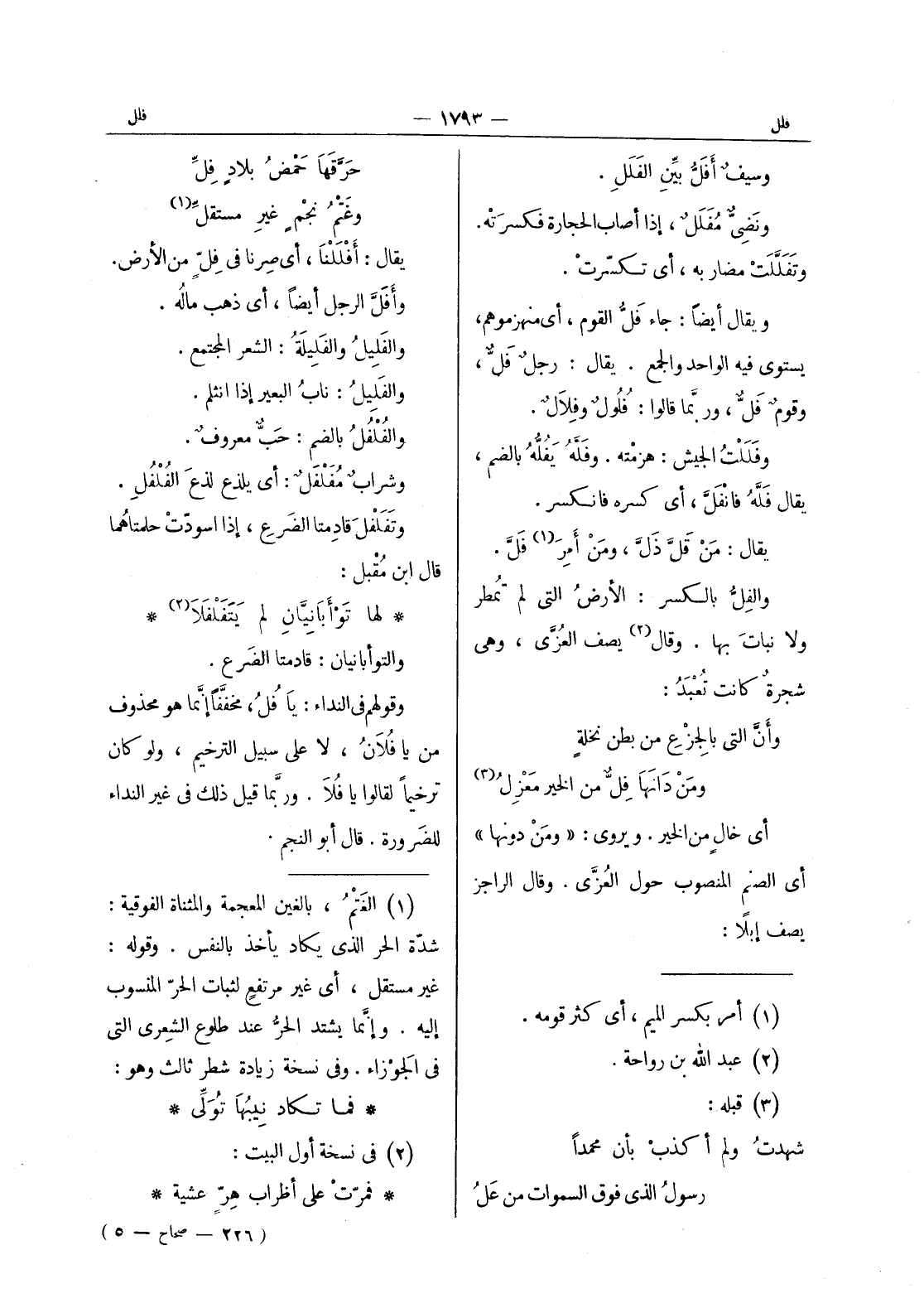 حرقها حمض بلاد فل وغتم نجم غير مستقل (¬1) يقال: أفْلَلْنا، أي صِرنا في فِلٍّ من الأرض. وأفَلَّ الرجلُ أيضاً، أي ذهب ماله. والفَليلُ والفَليلَةُ: الشعر المجتمع. والفَليلُ: نابُ البعير إذا انثلم. والفلفل بالضم: حب معروف. وشرابٌ مُفَلْفَلٌ: أي يلذع لذعَ الفلفل. وتفلفل قادمتا الضرع، إذ اسودت حلمتاهما قال ابن مقبل: