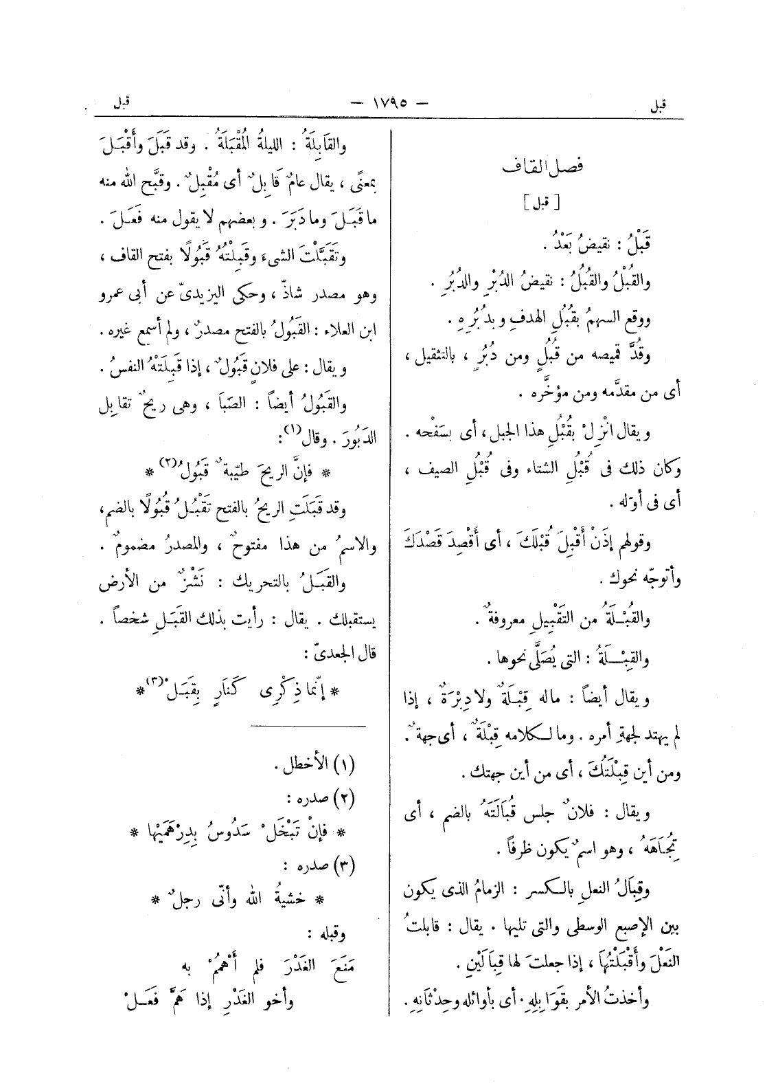 فإن الريحَ طيِّبةٌ قَبولُ (¬2) * وقد قَبَلَتِ الريحُ بالفتح تَقْبُلُ قُبولاً بالضم، والاسمُ من هذا مفتوحٌ، والمصدرُ مضمومٌ. والقَبَلُ بالتحريك: نَشْزٌ من الأرض يستقبلك. يقال: رأيت بذلك القبل شخصا. قال الجعدى: