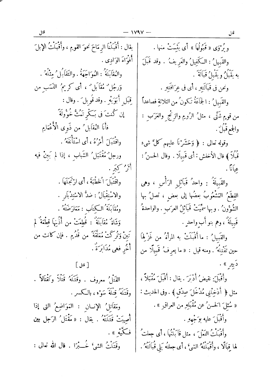 ويروى " قبولها " أي يئست منها. والقَبيلُ: الكفيل والعريفُ. وقد قَبَلَ به يَقْبُلُ ويَقْبِلُ قَبالَةً. ونحن في قَبالَتِهِ، أي في عِرافَتِهِ. والقَبيلُ: الجماعةُ تكون من الثلاثةِ فصاعداً من قومٍ شتَّى، مثل الروم والزنج والعرب: والجمع قُبُلٌ. وقوله تعالى: (وحشرنا عليهم كل شئ قبلا) قال الأخفش: أي قَبيلاً. وقال الحسن: عِياناً. والقبيلَةُ: واحد قبائِلِ الرأسِ، وهي القطعُ المَشْعوبُ بعضها إلى بعض، تصلُ بها الشُؤونُ. وبها سمِّيت قبائِلُ العربِ. والواحدةُ قَبيلةٌ، وهم بنو أبٍ واحدٍ. والقَبيلُ: ما أقْبَلَتْ به المرأة من غَزْلِها حين تَفْتِلُهُ. ومنه قيل: " ما يعرِفُ قَبيلاً من دَبيرٍ ". وأقْبَلَ: نقيض أدْبَرَ. يقال: أقبل مقبلا، مثل (أدخلني مدخل صدق) . وفى الحديث: " سئل الحسن عن مقبله من العراق ". وأقبل عليه بوجهه. وأقْبَلْتُ النعلَ، مثل قابَلْتُها، أي جعلت لها قبالا، وأقبلته الشئ، أي جعلته يلى قبالته.