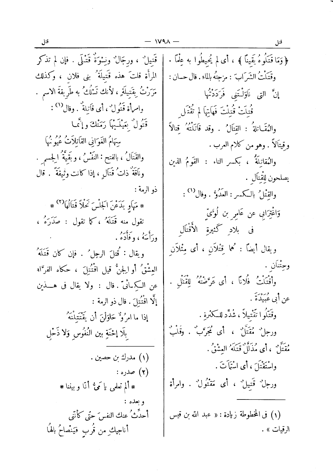 (وما قتلوه يَقيناً) ، أي لم يُحيطوا به عِلماً. وقَتَلْتُ الشرابَ: مزجته بالماء. قال حسان: إن التى ناولتنى فرددتها قتلت قتلت فهاتها لم تقتل والمُقاتلَةُ: القِتالُ. وقد قاتلْتُهُ قِتالاً وقِيتالاً. وهو من كلام العرب. والمُقاتِلَةُ، بكسر التاء: القومُ الذين يصلحون للقِتالِ. والقِتْلُ بالكسر: العَدُوُّ. وقال (¬1) : واغْتِرابي عن عامرِ بن لُؤَيٍّ في بلادٍ كثيرةِ الأقْتالِ ويقال أيضاً: هما قِتْلانِ، أي مِثْلانِ وحِتْنانِ. وأقْتَلْتُ فلاناً، أي عرضته للقتل. عن أبى عبيدة. وقتلوا تقتيلا، شدد للكثرة. ورجلٌ مقَتَّلٌ، أي مُجَرَّبٌ. وقَلْبٌ مُقَتَّلٌ، أي مُذلَّلٌ قتَلَهُ العِشْقُ. واسْتَقْتَلَ، أي اسْتماتَ. ورجلٌ قتيل، أي مقتول. وامرأة