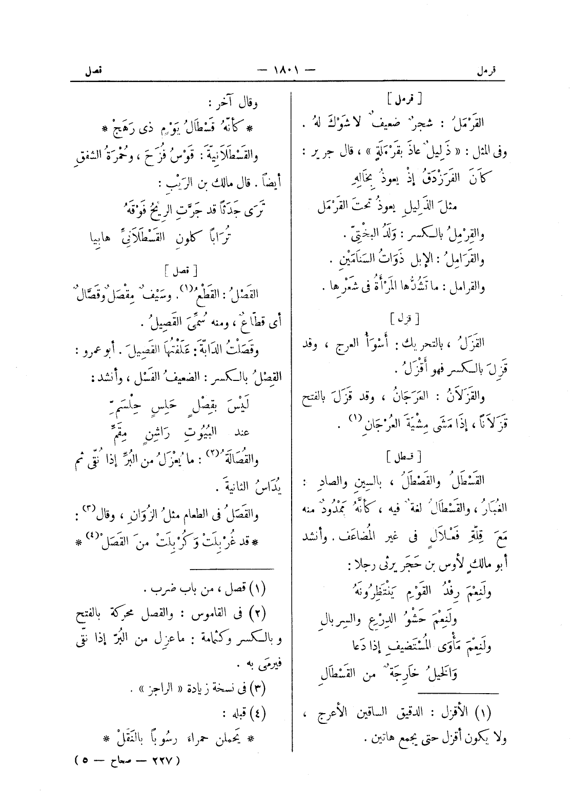 (¬1) الاقزل: الدقيق الساقين الاعرج، ولا يكون أقزل حتى يجمع هاتين.