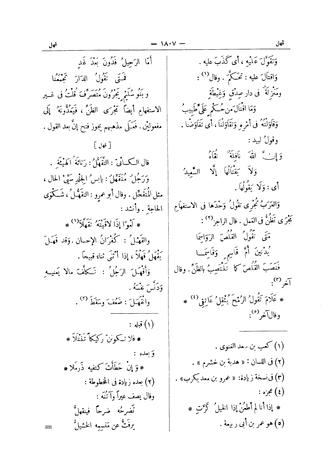 لَعْواً إذا لاقَيْتَهُ تَقَهَّلا (¬1) * والقَهْلُ: كُفرانُ الإحسان. وقد قَهَلَ يَقْهَلُ قَهْلاً، إذا أثنى ثناءً قبيحا. وأقهل الرجل: تكلف ما لا يعنيهِ ودَنَّسَ نفسَهُ. وانْقَهَلَ: ضَعُفَ وسقط (¬2) .