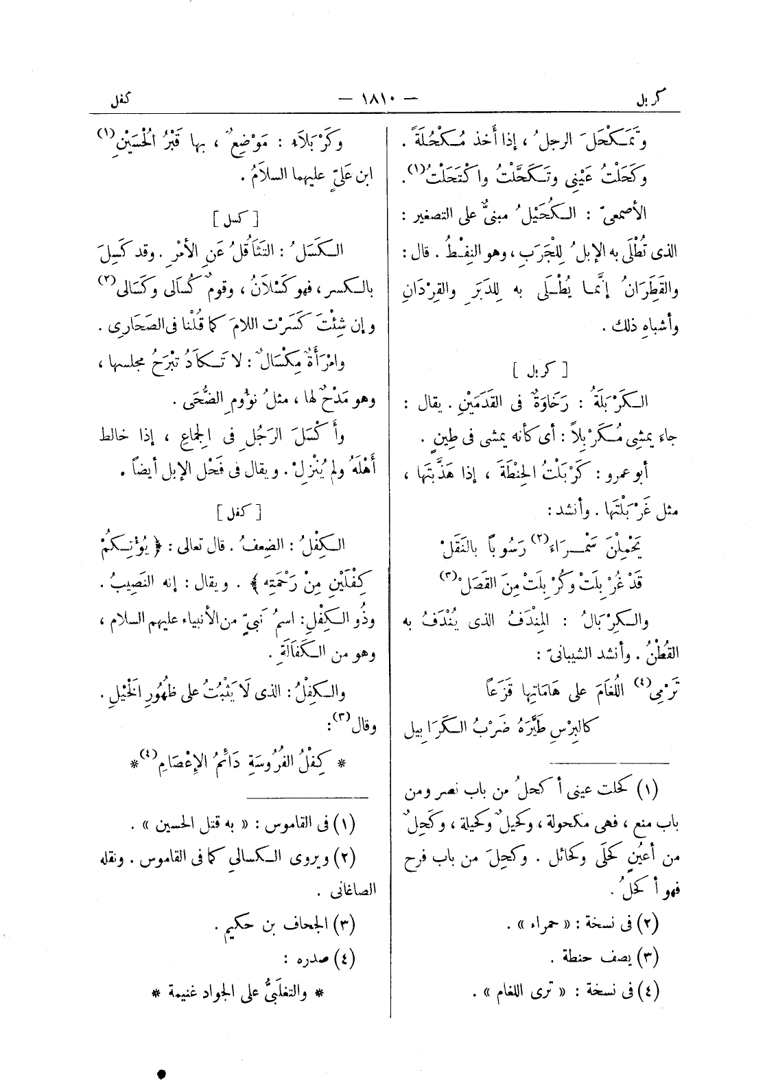 [كربل] الكَرْبَلَةُ: رخاوة في القدمينِ. يقال: جاء يمشي مُكَرْبِلاً: أي كأنَّه يمشي في طينٍ. أبو عمرو: كَرْبَلْتُ الحِنطةَ، إذا هذَّبْتَها، مثل غربلتها. وأنشد: يحملن سمراء (¬2) رسوبا بالنقل قد غربلت وكربلت من القصل (¬3) والكربال: المندف الذى يندف به القطن. وأنشد الشيباني: ترمى (¬4) اللغام على هاماتها قزعا كالبرس طيره ضرب الكرابيل