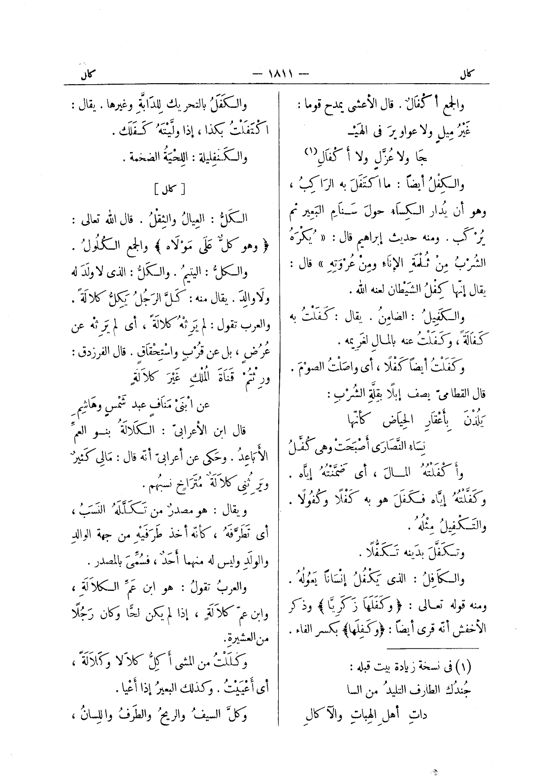 والجمع أكْفالٌ. قال الأعشى يمدح قوماً: غَيْرُ ميلٍ ولا عواويرَ في الهيجا ولا عزل ولا أكْفالِ (¬1) والكِفْلُ أيضاً: ما اكتَفَلَ به الراكبُ، وهو أن يُدار الكِساءُ حول سنام البعير ثمَّ يركب. ومنه حديث إبراهيم قال: " يكره الشرب من ثلمة الاناء ومن عروته " قال: يقال إنها كفل الشيطان لعنه الله. والكفيل: الضامن. يقال: كفلت به كَفالَةً، وكَفلت عنه بالمال لغَريمِه. وكَفَلْتُ أيضاً كَفْلاً، أي واصلتُ الصومَ. قال القطاميّ يصف إبلاً بقِلَّةِ الشُرْبِ: يَلُذْنَ بأَعْقارِ الحياضِ كأنَّها نِساءُ النَّصارى أصبَحَتْ وهي كُفَّلُ وأكْفَلْتُهُ المالَ، أي ضَمَنْتُهُ إيَّاه. وكَفَّلْتُهُ إيَّاه فكَفَلَ هو به كَفْلاً وكُفولاً. والتَكْفيلُ مثله. وتكَفَّلَ بدَينه تَكَفُّلاً. والكافِلُ: الذي يَكْفَلُ إنساناً يَعوله. ومنه قوله تعالى: (وكَفَلَها زَكَريَّا) وذكر الاخفش أنه قرى أيضا: (وكفلها) بكسر الفاء.