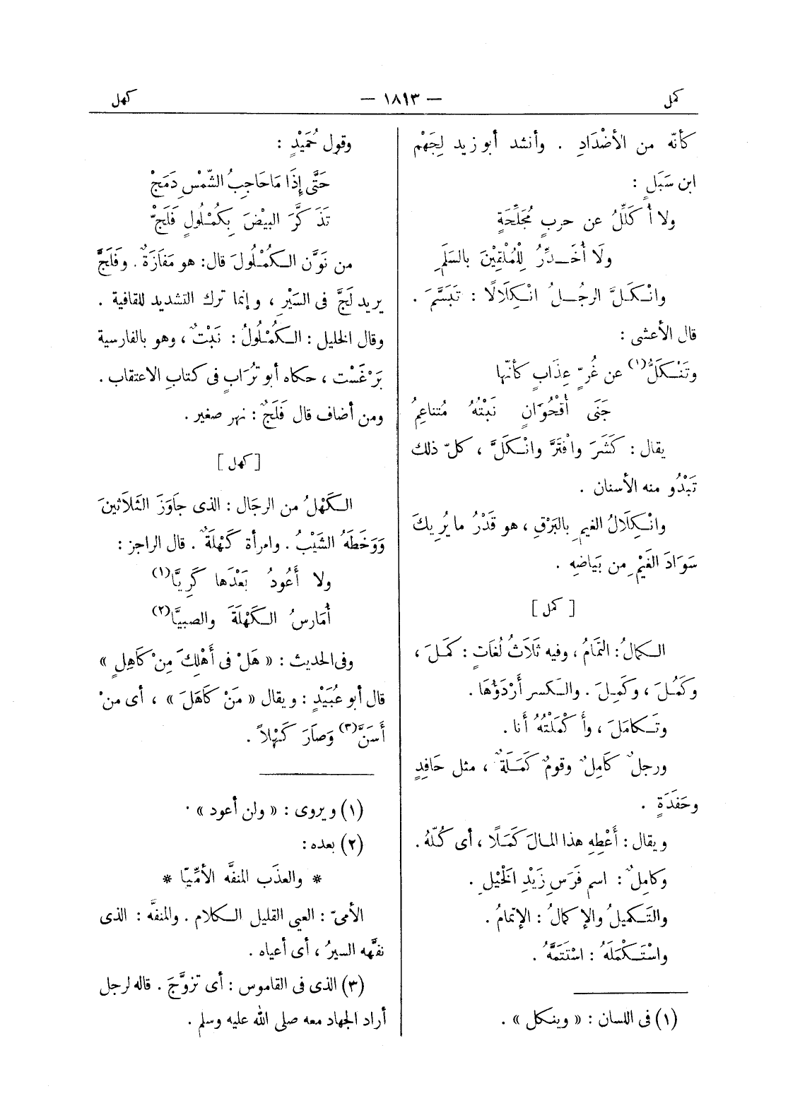 وقول حميد: حتى إذا ما حاجب الشمس دمج تذكر البيض بكملول فلج من نون الكملول قال: هو مفازة. وفلج يريد لج في السير، وإنما ترك التشديد للقافية. وقال الخليل: الكملول: نبت، وهو بالفارسية برغست، حكاه أبو تراب في كتاب الاعتقاب. ومن أضاف قال فلج: نهر صغير.
