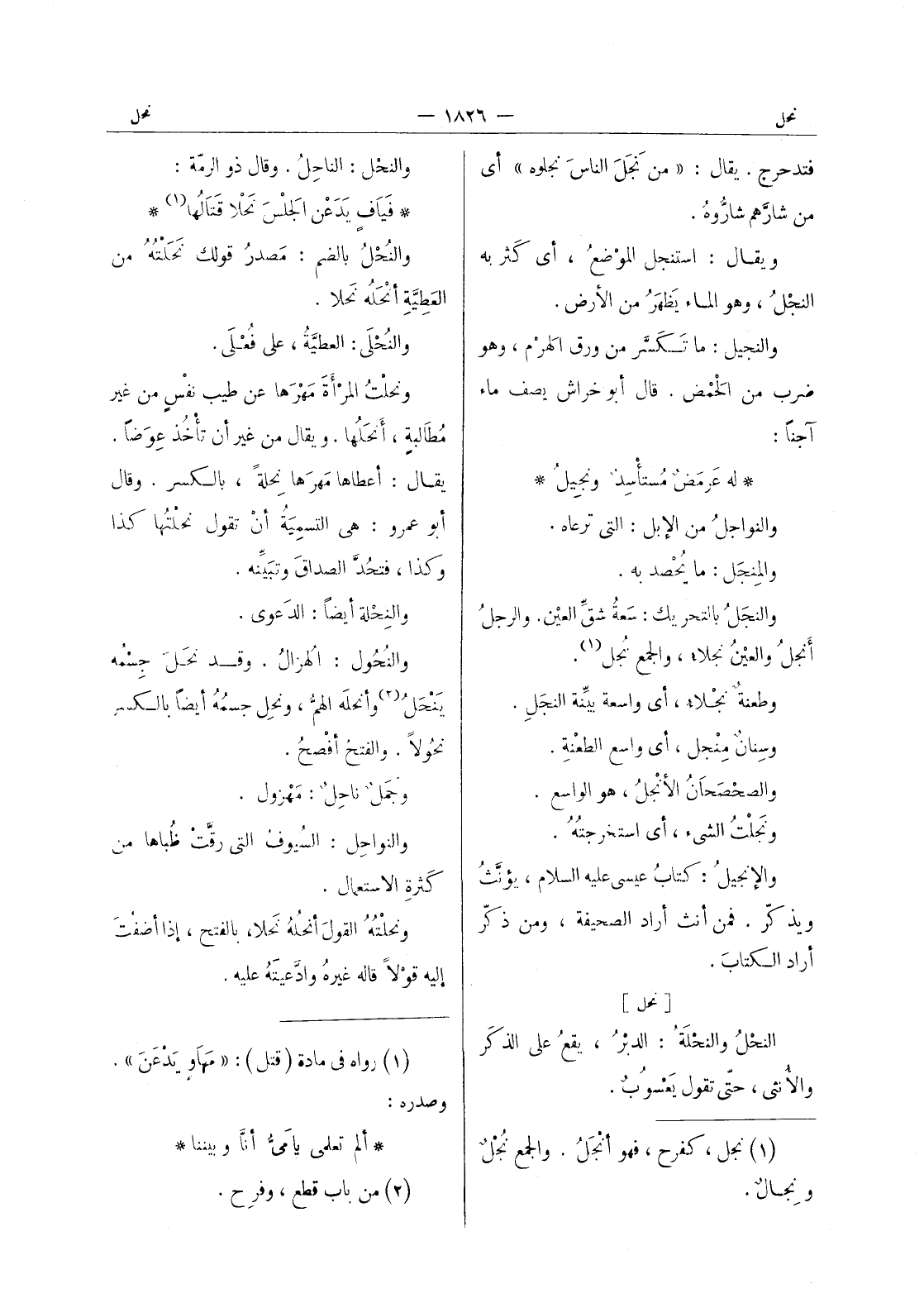 له عرمض مستأسد ونجيل * والنواجل من الإبل: التي ترعاه. والمِنْجَلُ: ما يُحْصد به. والنَجَلُ بالتحريك: سَعةُ شقِّ العين. والرجلُ أنجلُ والعينُ نجلاءُ، والجمع نُجل (¬1) . وطعنةٌ نَجْلاءُ، أي واسعة بيِّنة النَجَلِ. وسِنانٌ مِنْجل، أي واسعُ الطعنةِ. والصحصحان الانجل، هو الواسع. ونجلت الشئ، أي استخرجته. والانجيل: كتاب عيسى عليه السلام، يؤنث ويذكر. فمن أنث أراد الصحيفة، ومن ذكر أراد الكتاب.