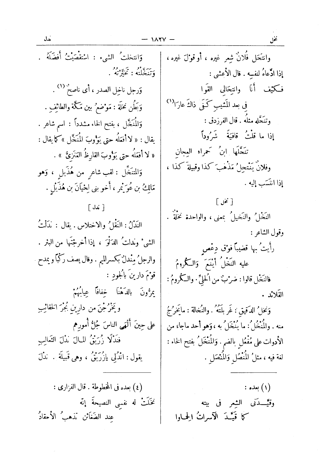 وانتخلت الشئ: استقْصَيْتُ أفضَلَهُ. وتَنَخَّلْتُه: تَخيَّرْتُهُ. ورجل ناخل الصدر، أي ناصح (¬1) . وبطن نخلة: موضع بين مكة والطائف. والمنخل، بفتح الخاء مشددا: اسم شاعر. يقال: " لا أفعله حتى يؤوب المنخل " كما يقال: " لا أفعله حتى يؤوب القارظ العنزي ". والمتنخل: لقب شاعر من هذيل، وهو مالك بن عويمر، أخو بنى لحيان بن هذيل.