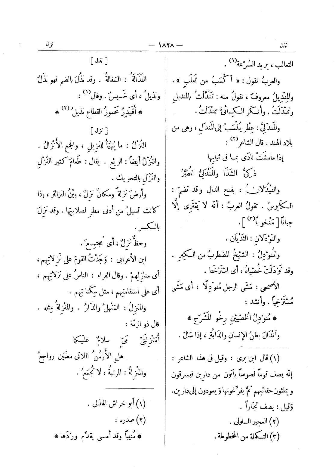 الثعالب، يريد السرعة (¬1) . والعرب تقول: " أكسب من ثعلب ". والمنديل معروف، تقول منه: تندلت بالمنديل وتمندلت. وأنكر الكسائي تمندلت. والمندلي: عطر يُنسب إلى المَنْدَلِ، وهي من بلاد الهند. قال الشاعر (¬2) : إذا ما مشتْ نادى بما في ثيابها ذكى الشذا والمنذلى المطير والنيْدَلانُ، بفتح الدال وقد تضم: الكابوس. تقول العرب: أنه لا يعترى إلا جبانا [منخوبا (¬3) ] . والنودلان: الثديان. والمنودل: الشيخ المضطرب من الكِبر. وقد نَوْدَلَتْ خَصياهُ، أي استرختا. الأصمعيّ: مشى الرجلُ مُنَوْدِلاً، أي مشى مُسْترخياً. وأنشد:
