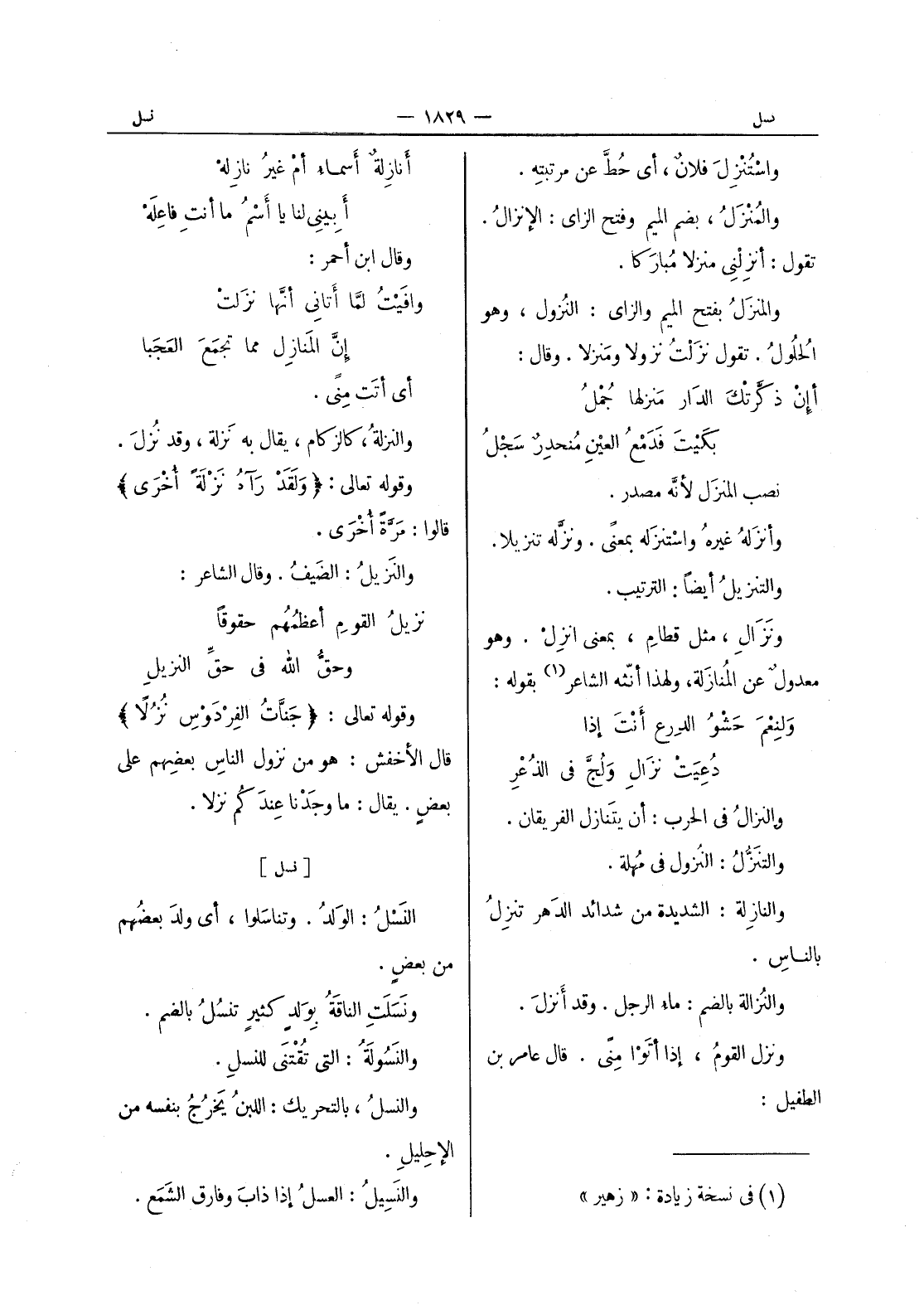 (*) أنازلة أسماء أم غير نازله أبينى لنا يا أسم ما أنت فاعله وقال ابن أحمر: وافيت لما أتاني أنَّها نزَلتْ إنَّ المَنازِل مما تجمَعُ العَجَبا أي أتَت مِنًى. والنزلةُ، كالزكام، يقال به نَزلة، وقد نُزلَ. وقوله تعالى: (ولَقَد رآهُ نَزْلَةً أخرى) قالوا: مَرَّةً أخرى. والنَزيلُ: الضَيفُ. وقال الشاعر: نزيلُ القومِ أعظُمُهم حقوقاً " وحقُّ الله في حقِّ النزيلِ وقوله تعالى: (جَنَّاتُ الفِرْدَوْسِ نُزُلاً) قال الأخفش: هو من نزول الناسِ بعضهم على بعض. يقال: ما وجدنا عندكم نزلا.