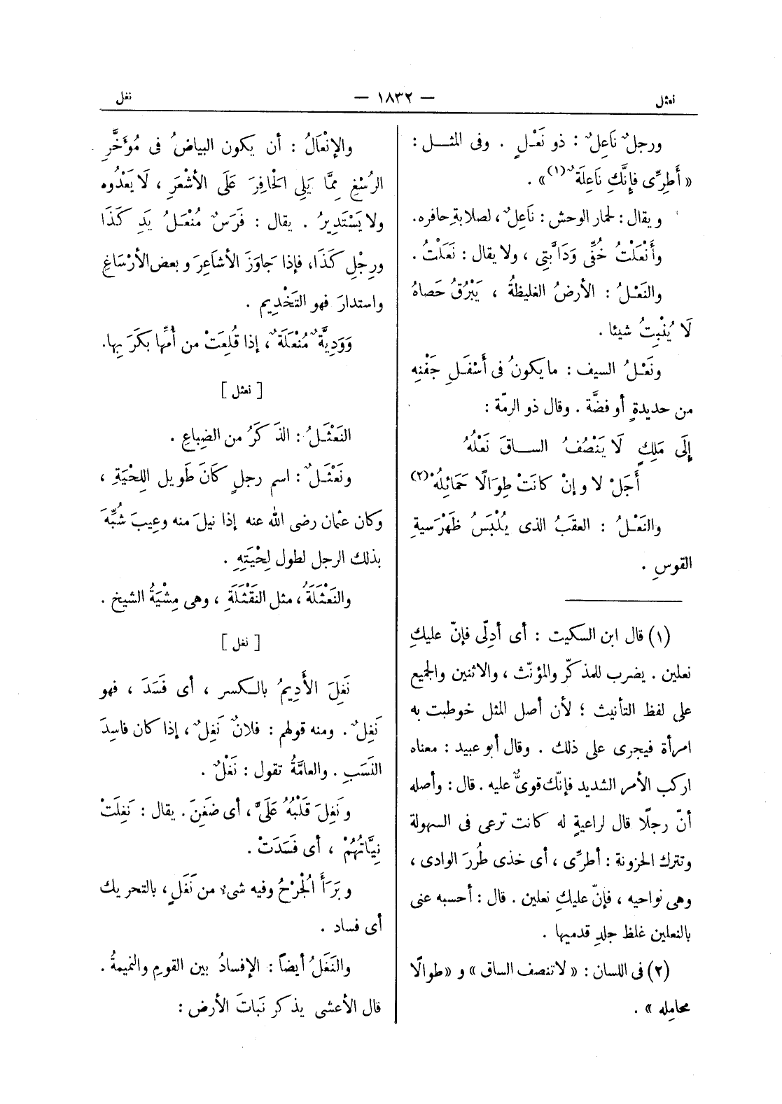 ورجل ناعل: ذو نعل. وفي المثل: " أَطِرِّي فاًنَّكِ ناعِلَةٌ (¬1) ". ويقال: لحمار الوحش: ناعِلٌ، لصلابة حافره. وأنْعَلْتُ خُفِّي ودابَّتي، ولا يقال: نَعَلْتُ. والنَعْلُ: الأرضٌ الغليظةُ، يبرق حصاه لا ينبت شيئا. ونَعْلُ السيف: ما يكون في أسفل جَفْنِهِ من حديدةٍ أو فضَّة. وقال ذو الرمّة. إلى مَلِكٍ لا يَنْصُفُ الساقَ نَعْلُهُ أجلْ لا وإنْ كانت طِوالاً حَمائِلُهْ (¬2) والنَعْلُ: العَقَبُ الذي يُلبس ظهرسية القوس.