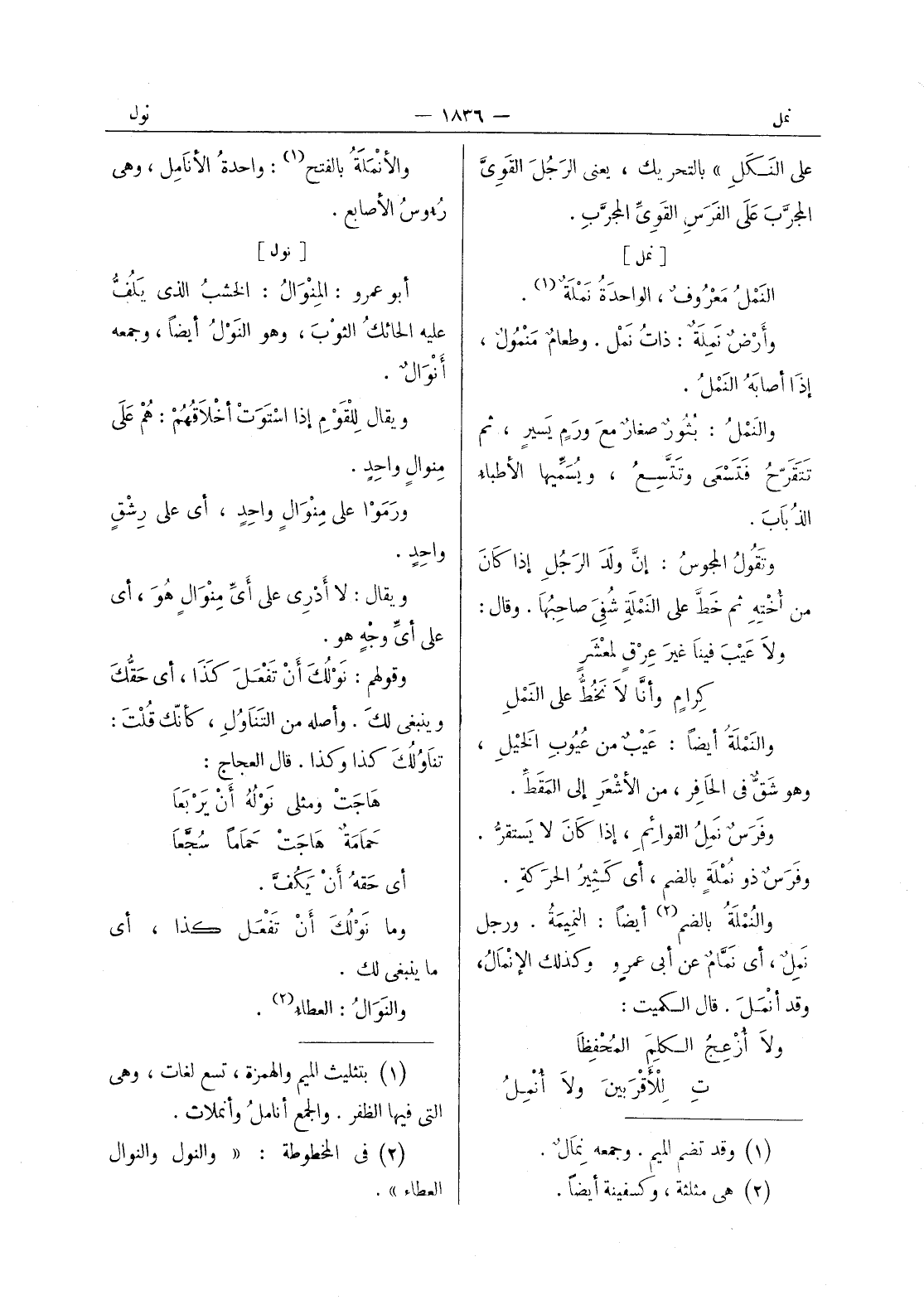 [نمل] النَمْلُ معروفٌ، الواحدة نَمْلَةٌ (¬1) . وأرضٌ نَمِلَةٌ: ذات نَمْل. وطعامٌ مَنْمولٌ، إذا أصابه النَمْلُ. والنَمْلُ: بُثورٌ صِغارٌ مع ورَمٍ يسيرٍ، ثم تَتَقَرَّحُ فتَسْعى وتَتَّسعُ، ويسمِّيها الأطباءُ الذُبابَ. وتقولُ المجوسُ: إنَّ ولدَ الرجلِ إذا كانَ من أُخْتِهِ ثم خطَّ على النَمْلَةِ شُفِيَ صاحبُها. وقال: ولا عَيْبَ فينا غيرَ عِرْقٍ لمعْشَرٍ كِرامٍ وأنَّا لا نَخُطَّ على النَمْلِ والنَمْلَةُ أيضاً: عيبٌ من عيوب الخيل، وهو شَقٌّ في الحافِر، من الأشعَرِ إلى المَقَطِّ. وفرسٌ نَمِلُ القوائمِ، إذا كان لا يستقرُّ. وفرسٌ ذو نُمْلَةٍ بالضم، أي كثيرُ الحركةِ. والنُمْلَةُ بالضم (¬2) أيضاً: النميمَةُ. ورجلٌ نَمِلٌ، أي نَمَّامٌ عن أبي عمرٍو وكذلك الإنْمالُ، وقد أَنْمَلَ. قال الكميت: ولا أُزْعِجُ الكلِمَ المُحْفِظا تِ للاقربين ولا أنمل