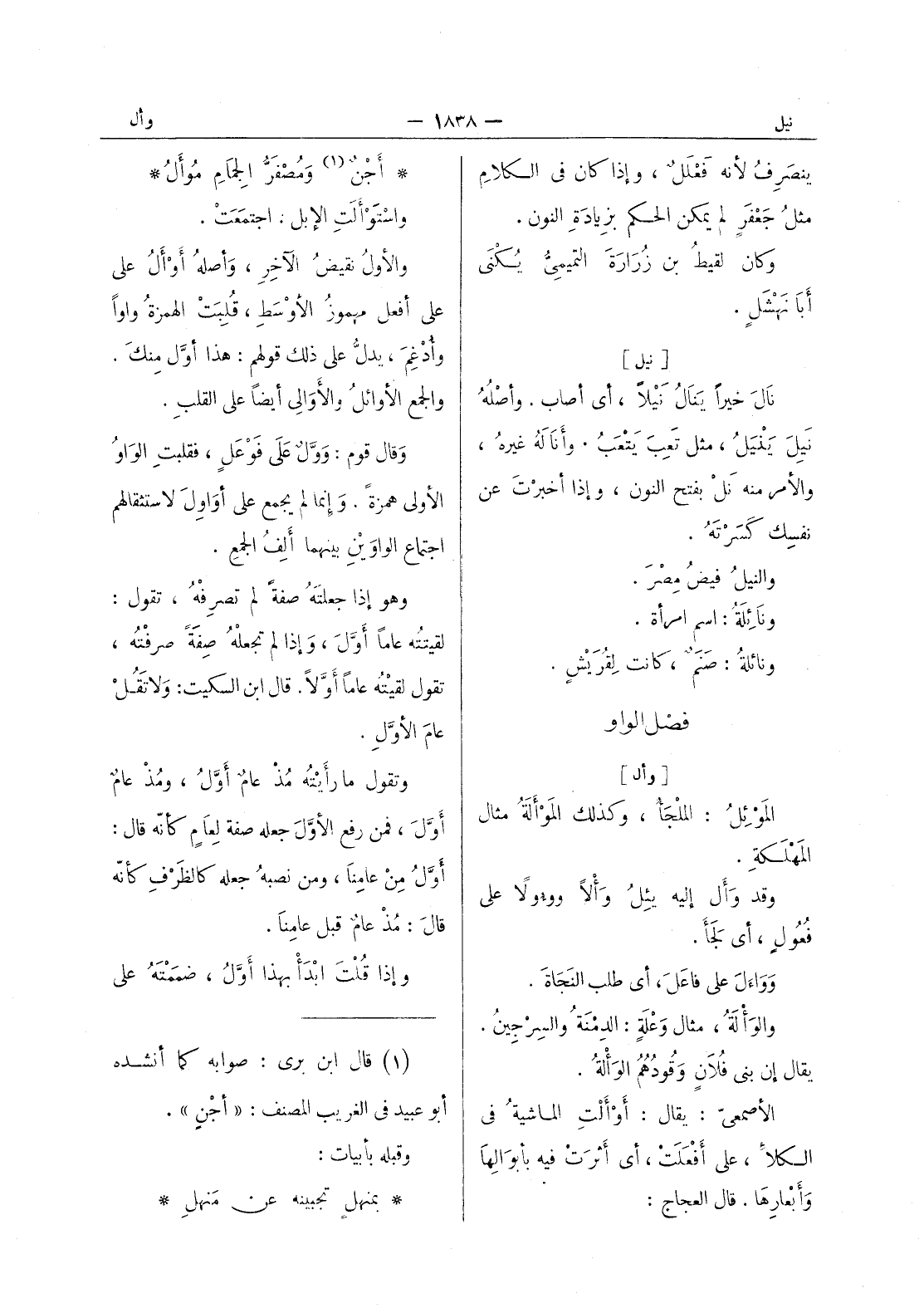 أجن (¬1) ومصفر الجمام موأل * واستوألت الابل: اجتمعت. والاول نقيض الآخر، وأصله أوأل على على أفعل مهموز الاوسط، قلبت الهمزة واوا وأدغم، يدل على ذلك قولهم: هذا أول منك. والجمع الاوائل والاوالى أيضا على القلب. وقال قوم: وول على فوعل، فقلبت الواو الاولى همزة. وإنما لم يجمع على أواول لاستثقالهم اجتماع الواوين بينهما ألف الجمع. وهو إذا جعلته صفة لم تصرفه، تقول: لقيتته عاما أول، وإذا لم تجعله صفة صرفته، تقول لقيته عاما أولا. قال ابن السكيت: ولا تقل عام الاول. وتقول ما رأيته مذ عام أول، ومذ عام أول، فمن رفع الاول جعله صفة لعام كأنه قال: أول من عامنا، ومن نصبه جعله كالظرف كأنه قال: مذ عام قبل عامنا. وإذا قلت ابدأ بهذا أول، ضممته على