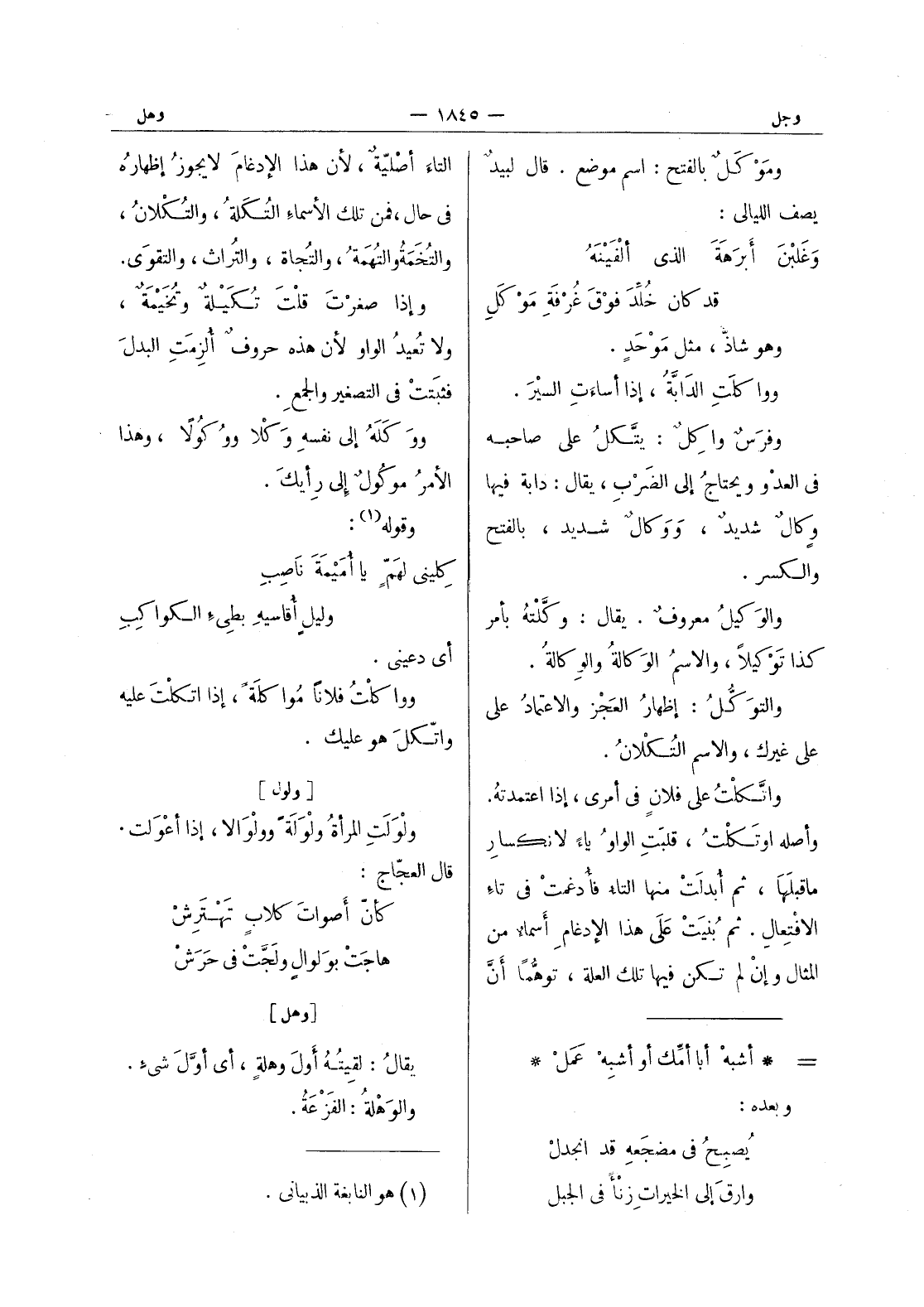 التاء أصلية، لان هذا الادغام لا يجوز إظهاره في حال، فمن تلك الاسماء التكلة، والتكلان، والتخمة والتهمة، والتجاة، والتراث، والتقوى. وإذا صغرت قلت تكيلة وتخيمة، ولا تعيد الواو لان هذه حروف الزمت البدل فثبتت في التصغير والجمع. ووكله إلى نفسه وكلا كولا، وهذا الامر موكولٌ إلى رأيِكَ. وقوله (¬1) : كِليني لهَمٍّ يا أُمَيْمَةَ ناصِبِ وليلٍ أقاسيه بطئ الكواكب أي دعينى. وواكَلْتُ فلاناً مُواكَلَةً، إذا اتَّكلْتَ عليه واتكل هو عليك.