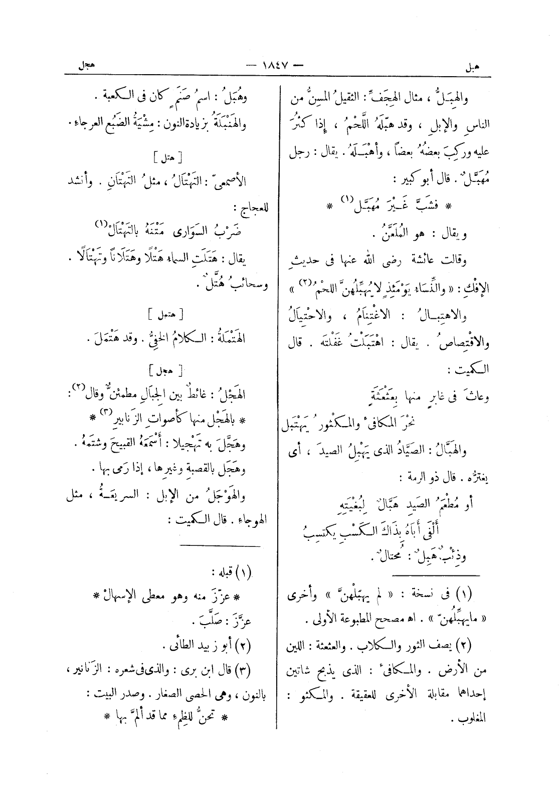 بالهجل منها كأصوات الزنابير (¬3) * وهجل به تهجيلا: أسمعه القبيح وشتمه. وهَجَلَ بالقصبة وغيرها، إذا رمى بها. والهَوْجَلُ من الابل: السريعة، مثل الهوجاء. قال الكميت