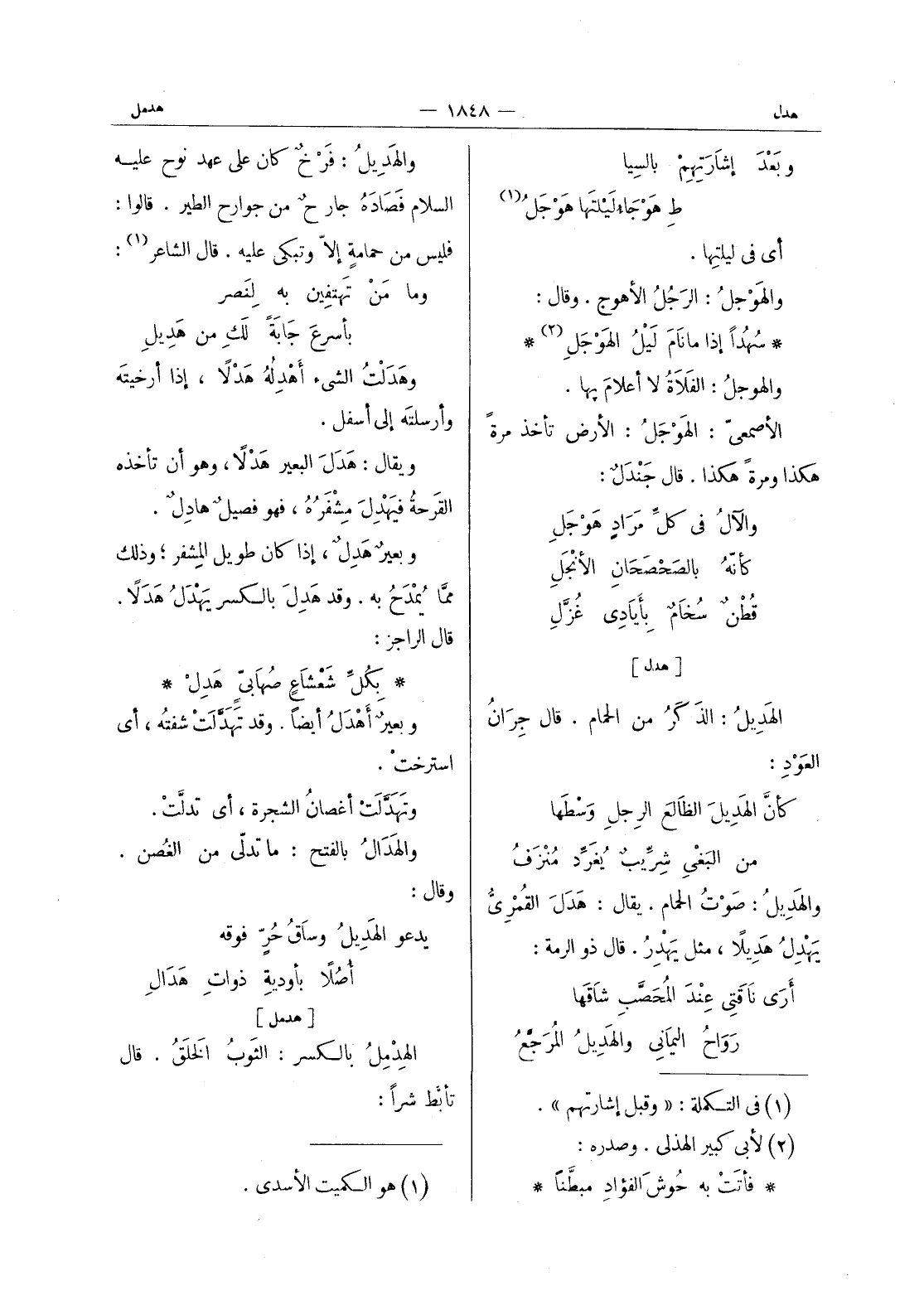 [هدل] الهَديلُ: الذكرُ من الحمام. قال جِرانُ العَوْدِ: كأنَّ الهَديلَ الظالعَ الرِجلِ وَسْطها من البَغْي شِرِّيبٌ يُغَرِّدُ مُنْزَفُ والهَديلُ: صوت الحمام. يقال: هَدَلَ القُمْرِيُّ يَهْدِلُ هَديلاً، مثل يَهْدِرُ. قال ذو الرمّة: أرى ناقَتي عندَ المُحَصَّبِ شاقَها رَواحُ اليماني والهَديلُ المُرَجَّعُ