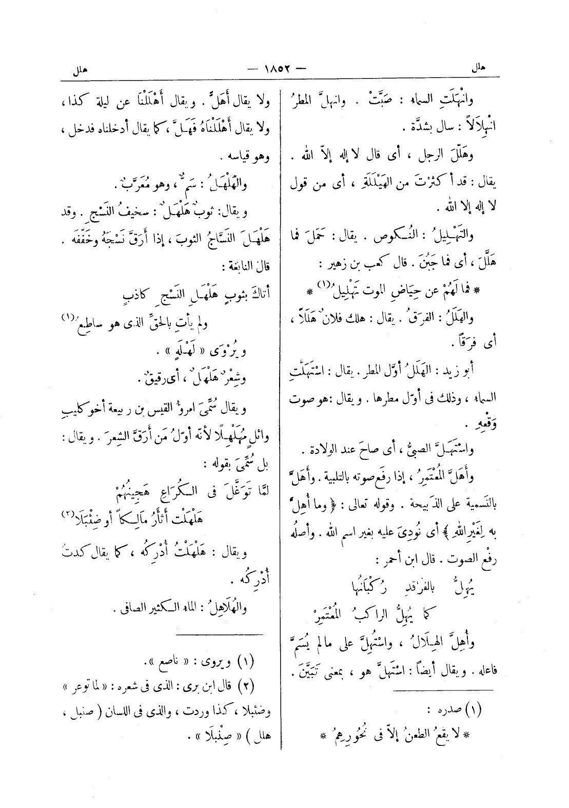 فما لهمْ عن حِياضِ الموت تَهْليلُ (¬1) * والهَلَلُ: الفرَقُ. يقال: هلك فلانٌ هَلَلاً، أي فرَقاً. أبو زيد: الهَلَلُ أوَّل المطر. يقال: اسْتُهْلَتِ السماءُ، وذلك في أوَّل مطرها. ويقال: هو صوتُ وقْعِهِ. واسْتَهَلَّ الصبيُّ، أي صاح عند الولادة. وأهَلَّ المُعْتَمِرُ، إذا رفع صوته بالتلبية. وأهَلَّ بالتسمية على الذبيحة. وقوله تعالى: (وما أُهِلَّ به لغيرِ اللهِ) أي نودِيَ عليه بغير اسم الله. وأصله رفع الصوت. قال ابن أحمر: يهلل بالفرقد ركبانها كما يهل الراكب المعتمر وأهل الهلال، واسْتُهِلَّ على ما لم يسمّ فاعله. ويقال أيضاً: اسْتَهَلَّ هو، بمعنى تبين.