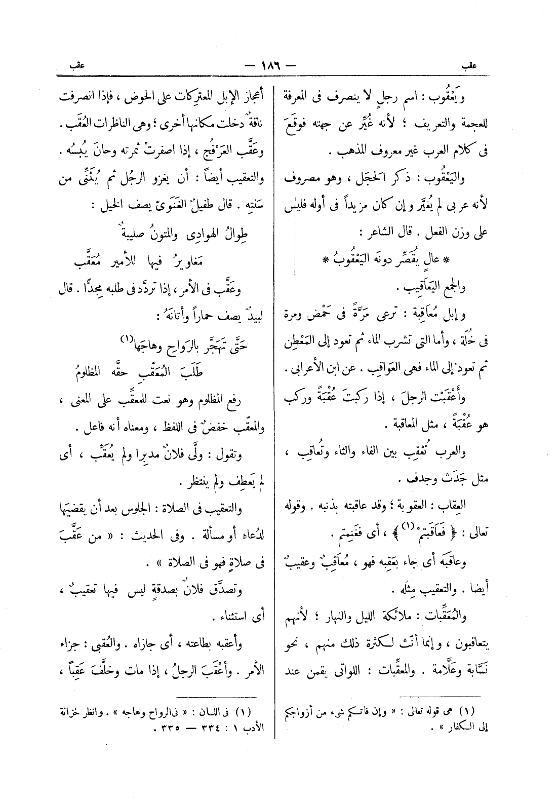 أعجاز الابل المعتركات على الحوض، فإذا انصرفت ناقةٌ دخلت مكانها أخرى، وهي الناظرات العُقَب. وعَقَّب العَرْفُج، إذا اصفرّت ثمرته وحان يُبسُه. والتعقيب أيضاً: أن يغزو الرجل ثم يُثَنِّي من سنته. قال طفيلٌ الغَنَويّ يصف الخيل: طِوالُ الهوادي والمتونُ صليبةٌ * مَغاويرُ فيها للأمير مُعَقَّب وعَقَّب في الأمر، إذا تردَّد في طلبه مجدا. قال لبيد يصف حمارا وأتانه: حتى تهجر بالرواح وهاجها (¬1) * طلب المعقب حقه المظلوم رفع المظلوم وهو نعت للمعقب على المعنى، والمعقب خفض في اللفظ، ومعناه أنه فاعل. وتقول: ولى فلان مدبِراً ولم يُعَقِّب، أي لم يَعطِف ولم ينتظر. والتعقيب في الصلاة: الجلوس بعد أن يقضيها لدعاءٍ أو مسألة. وفي الحديث: " من عَقَّبَ في صلاةٍ فهو في الصلاة ". وتصدَّق فلانٌ بصدقةٍ ليس فيها تعقيبٌ، أي استثناء. وأعقبه بطاعته، أي جازاه. والعُقبى: جزاء الأمر. وأعقَبَ الرجلُ، إذا مات وخلف عقبا،