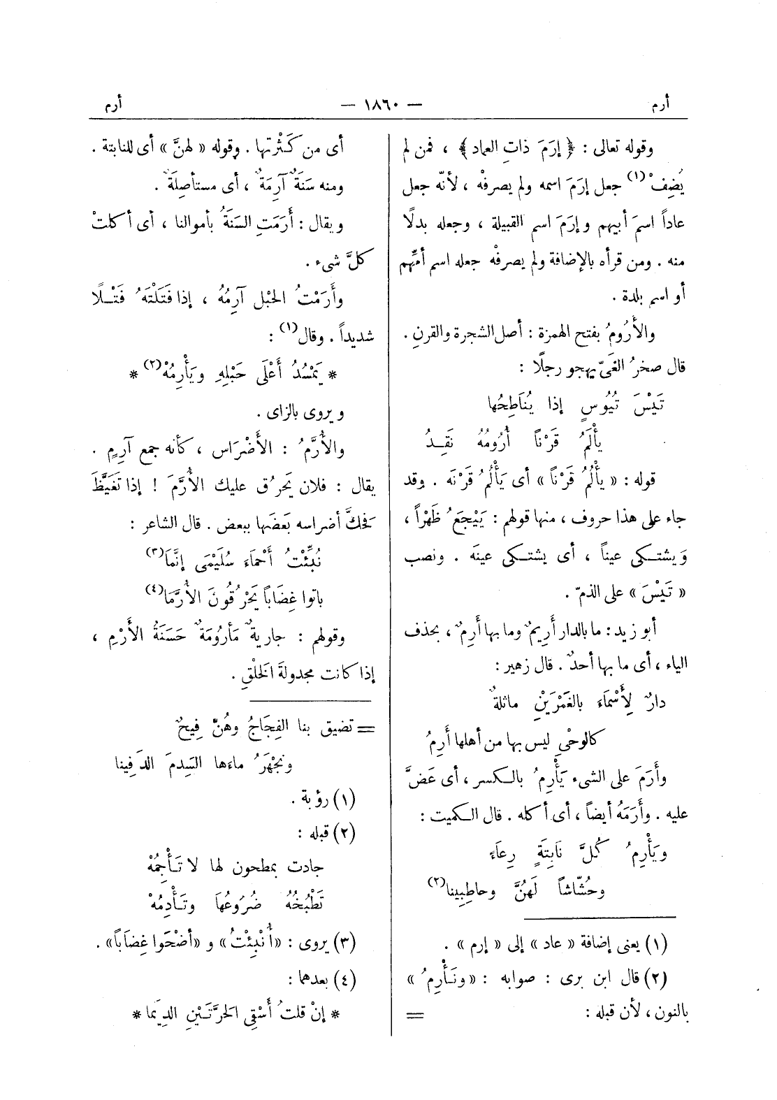 وقوله تعالى: (إرم ذات العماد) ، فمن لم يضف (¬1) جعل إرم اسمه ولم يصرفه، لانه جعل عادا اسم أبيهم وإرم اسم القبيلة، وجعله بدلا منه. ومن قرأه بالاضافة ولم يصرفه جعله اسم أمهم أو اسم بلدة. والاروم بفتح الهمزه: أصل الشجرة والقرنِ. قال صخرُ الغَيّ يهجو رجلاً: تَيْسَ تُيوسٍ إذا يُناطِحُها يأْلَمُ قَرْناً أُرومُهُ نَقِدُ قوله: " يألم قرنا " أي يألم قرنه. وقد جاء على هذا حروف، منها قولهم: ييجع ظهرا، ويشتكي عينا، أي يشتكى عينه. ونصب " تيس " على الذم. أبو زيد: ما بالدار أريم وما بها أَرِمٌ، بحذف الياء، أي ما بها أحدٌ. قال زهير: دارٌ لإَسْماء بالَغمْريْنِ ماثلة كالوحْي ليس بها من أهلها أَرِمُ وأرم على الشئ يأرم بالكسر، أي عَض عليه. وأَرَمَهُ أيضاً، أي أكله. قال الكميت: ويأرم كُلَّ نابِتَةٍ رِعاءً وحُشّاشاً لَهُنَّ وحاطبينا (¬2)
