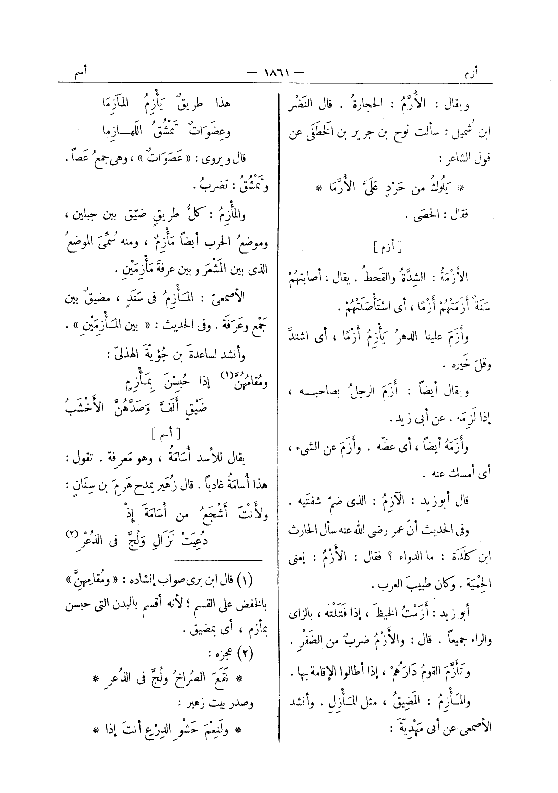 هذا طريق يأزم المآزما وعضوات تمشق اللهازما قال ويروى: " عصوات "، وهى جمع عصا. وتمشق: تضرب. والمأزم: كلُّ طريقٍ ضيّق بين جبلين، وموضع الحرب أيضا مأزم، ومنه سمى الموضع الذى بين المشعر وبين عرفة مأزمين. الاصمعي: المأزم في سند، مضيق بين جمع وعرفة. وفي الحديث: " بين المأزمين ". وأنشد لساعدة بن جؤيَّة الهذَلي: ومقامهنَّ (¬1) إذا حُبِسْنَ بمَأزِمٍ ضَيْقٍ ألَفَّ وَصَدَّهُنَّ الاخشب