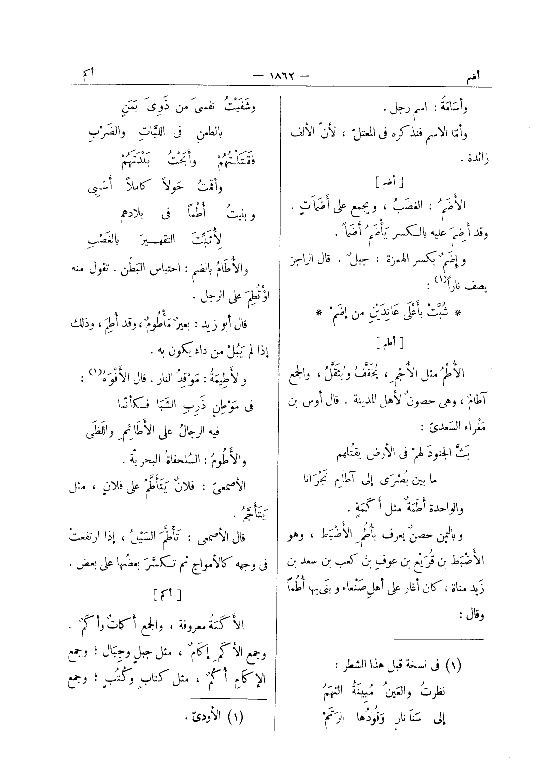 وشفيت نفسي من ذوى يمن بالطعن في اللبات والضرب فقتلتهم وأبحت بلدتهم وأقمت حولا كاملا أسبى وبنيت أطما في بلادهم لاثبت التقهير بالغصب والاطام بالضم: احتباس البطن. تقول منه اؤْتُطِمَ على الرجل. قال أبو زيد: بعيرٌ مَأطَومٌ، وقد أُطِمَ، وذلك إذا لم يَبُلْ من داء يكون به. والأَطيمَةُ: مَوْقِدُ النار. قال الأَفْوَهُ (¬1) : في مَوْطِنٍ ذَرِبِ الشَبا فكأَنّما فيه الرجالُ على الأَطائِمِ واللَظى والاطوم: السلحفاة البحرية. الاصمعي: فلان يتأطم على فلانٍ، مثل يَتَأَجَّمُ. قال الأصمعي: تَأَطَّمَ السَيْلُ، إذا ارتفعتْ في وجهه كالأمواج ثم تكسَّرَ بعضها على بعض.